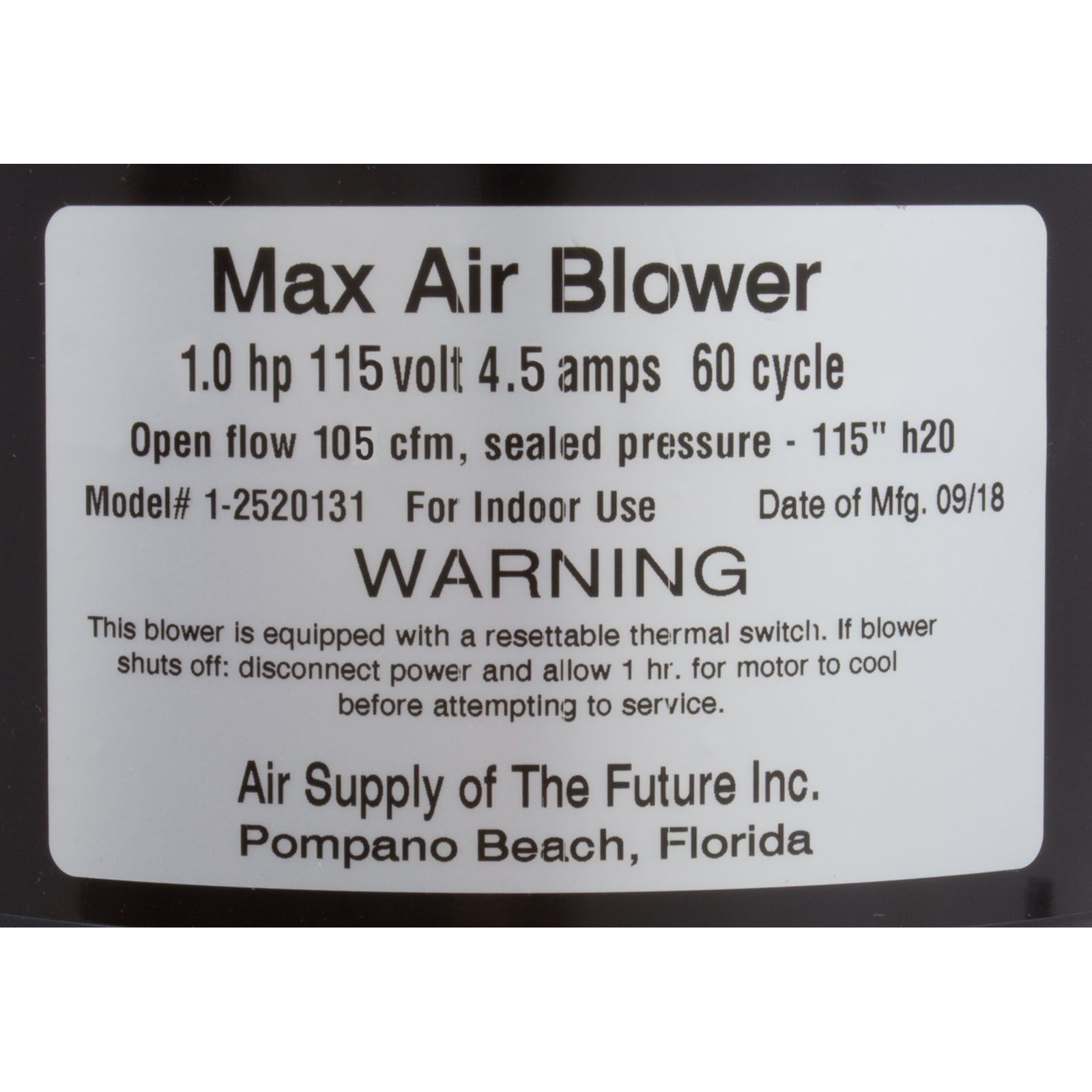 Blower, Air Supply Max Air, 1.0hp, 115v, 4.5A, 48" AMP Cord