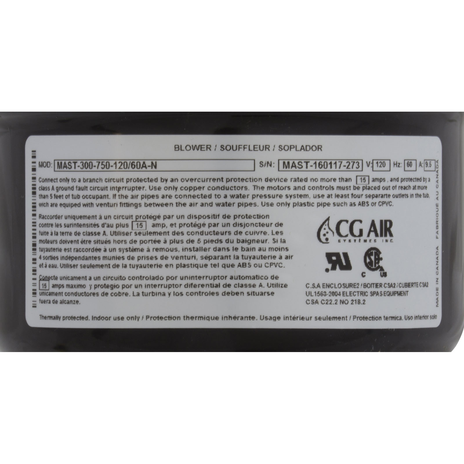 MAST300-750-120/60AN Blower CG Air Millenium AS 115v 9.5A w/Htr 3ft Nema AS