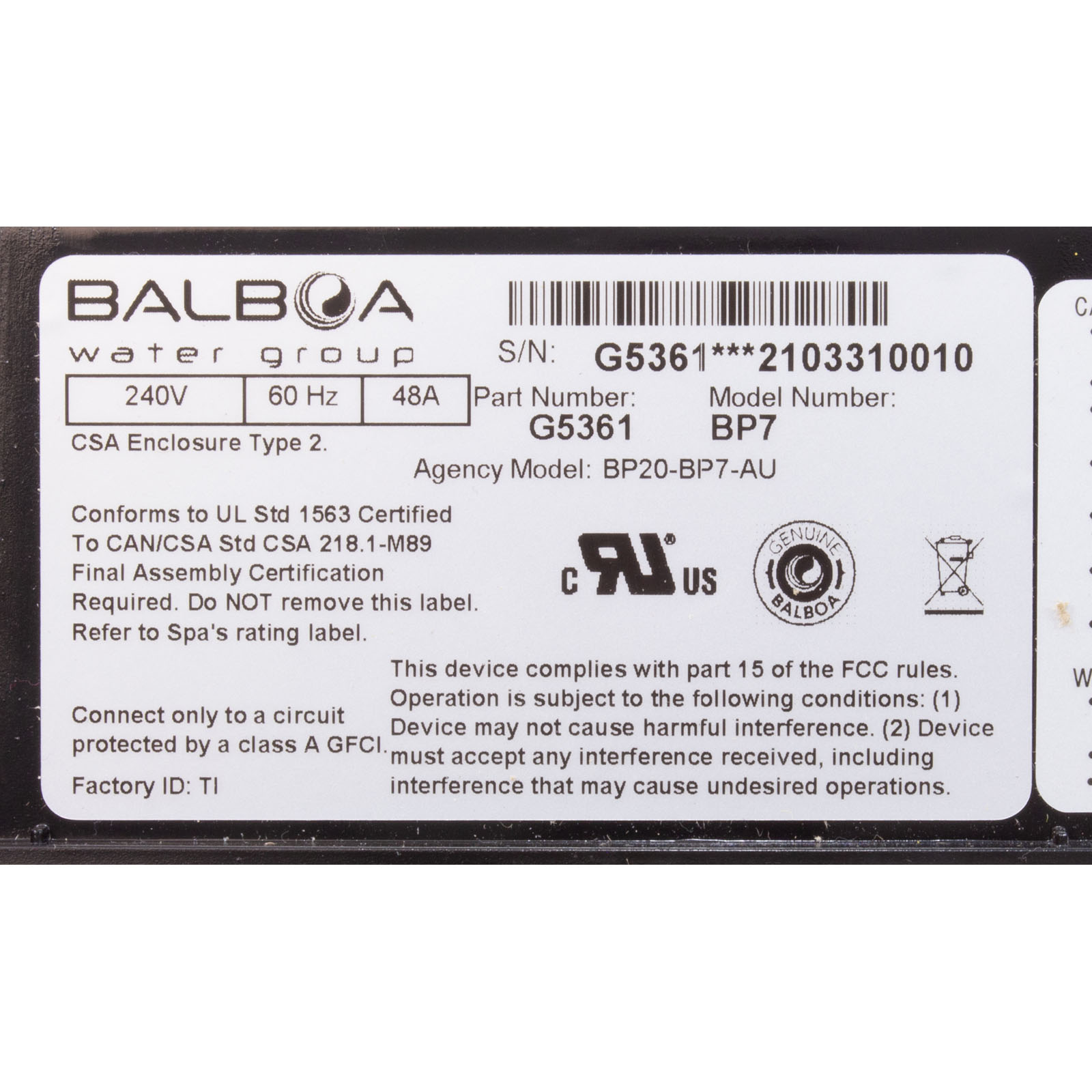g5361 balboa water group bp7 control box only