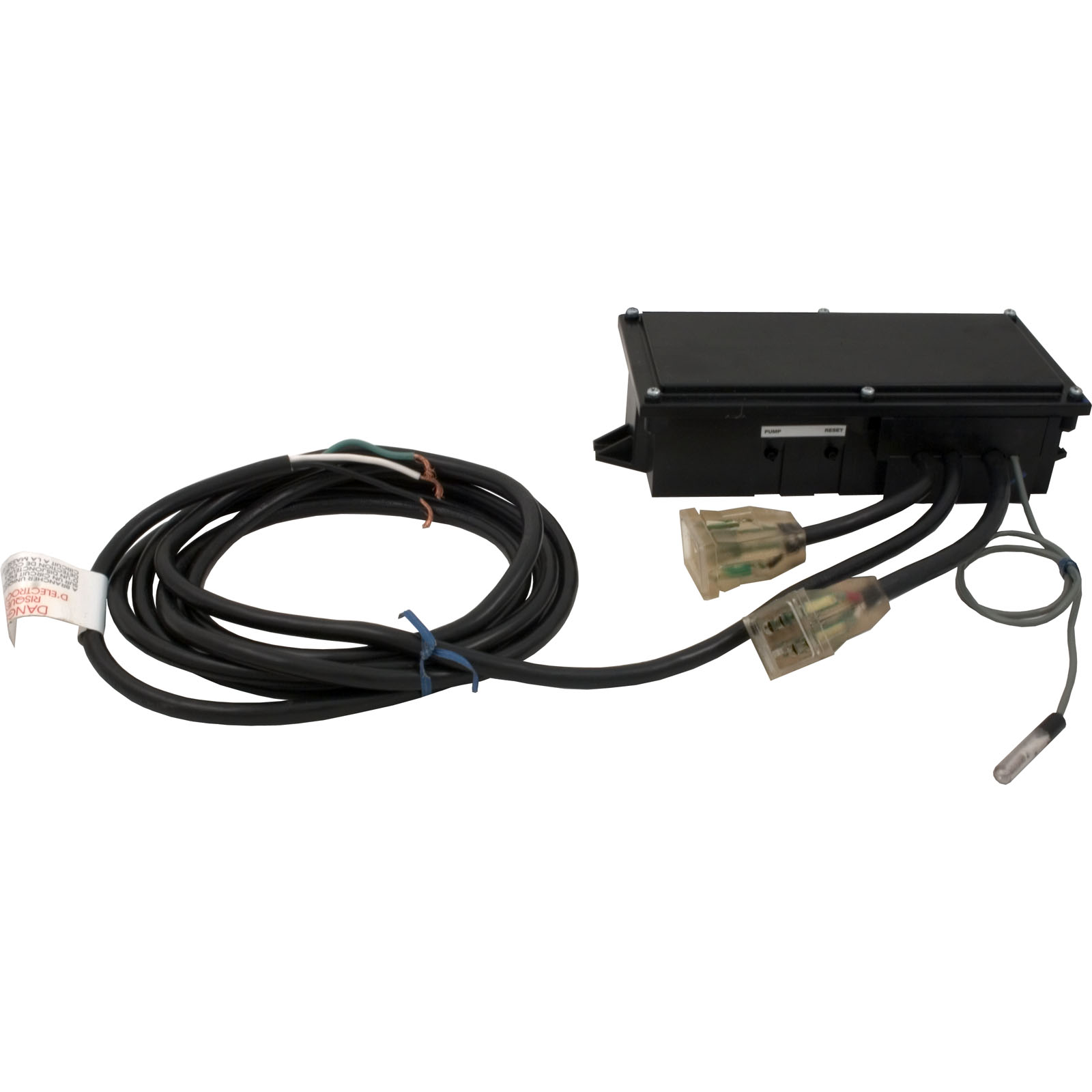 This series of controls is designed specifically for spas employing motor heat recovery jackets. The control includes a hi limit with remote, spaside reset, a 10-minute timer circuit for direct pump control, two momentary contact air switches for hi limit reset and timer control initiation, and three power cords for line, pump, and spaside control faceplate label designed of these controls incorporates READY, HEAT ON, and TEMP FAULT indicators which are illuminated to display equipment status.