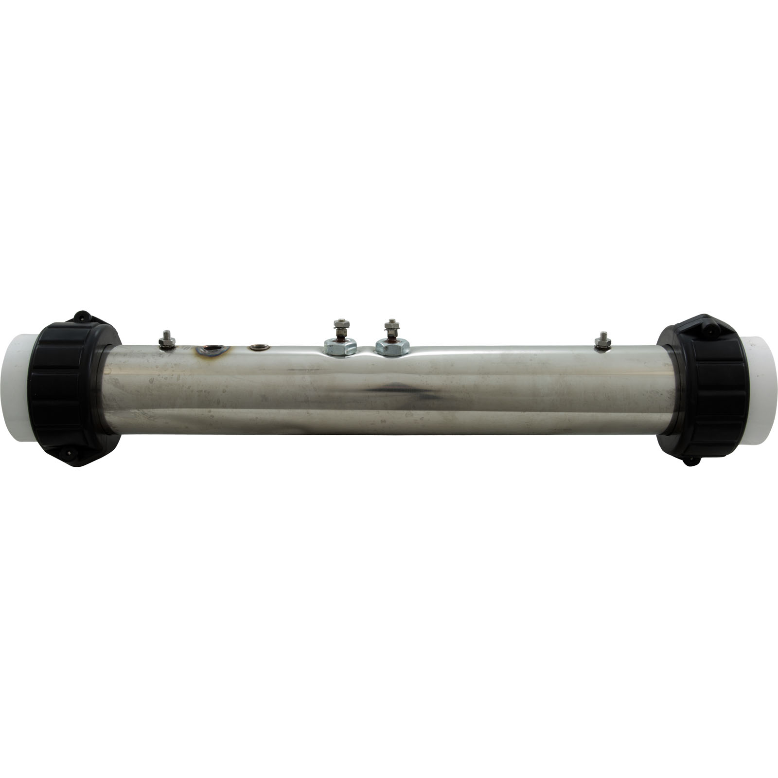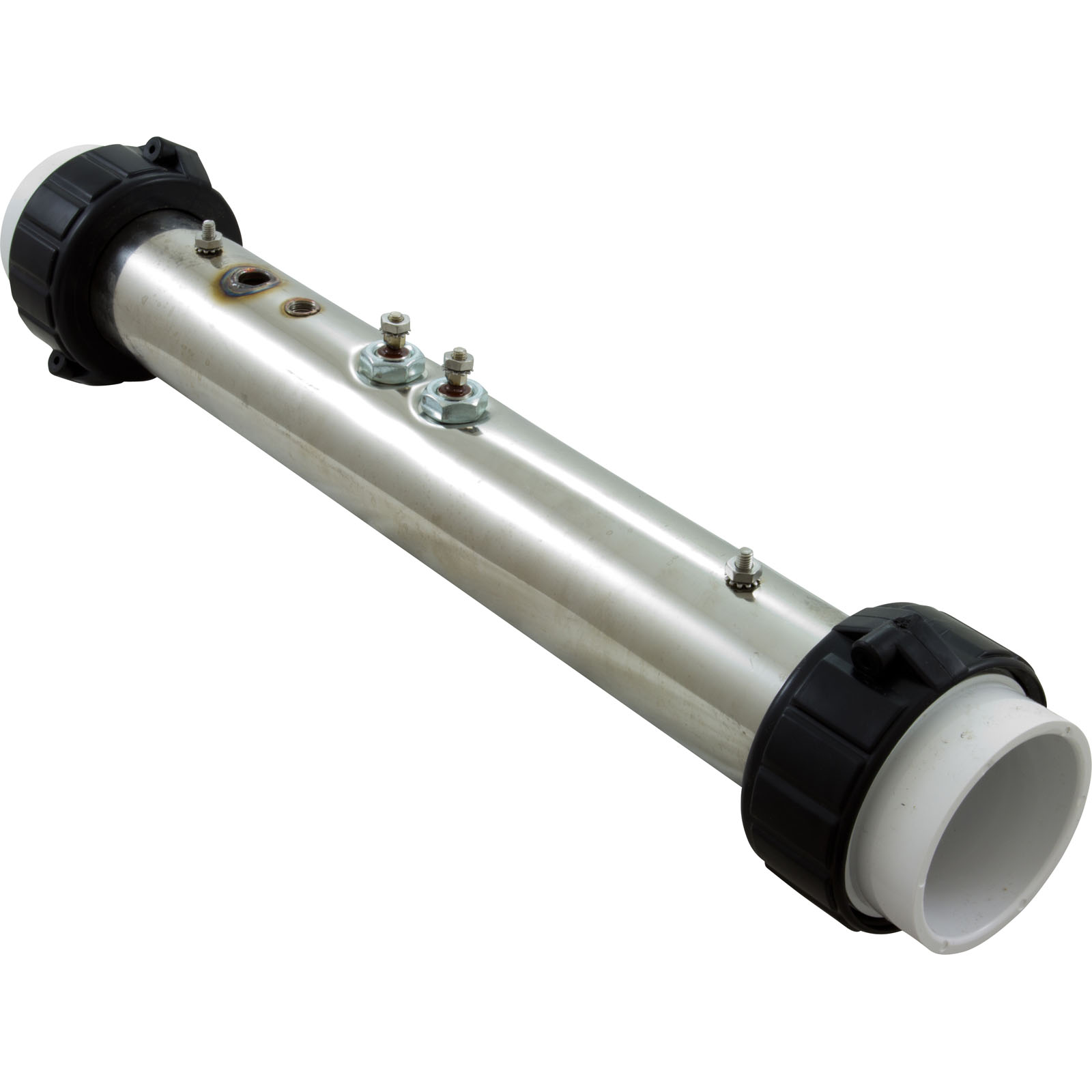 Stainless steel flo-thru replacement heater assembly. Measures 15" x 2" and has (2) mounting studs, pressure switch tap at 0 degrees from the heater terminals, external thermowell and a 5.5kW element. Commonly found on ACC (Applied Computer Controls) or Acura Spa control systems.