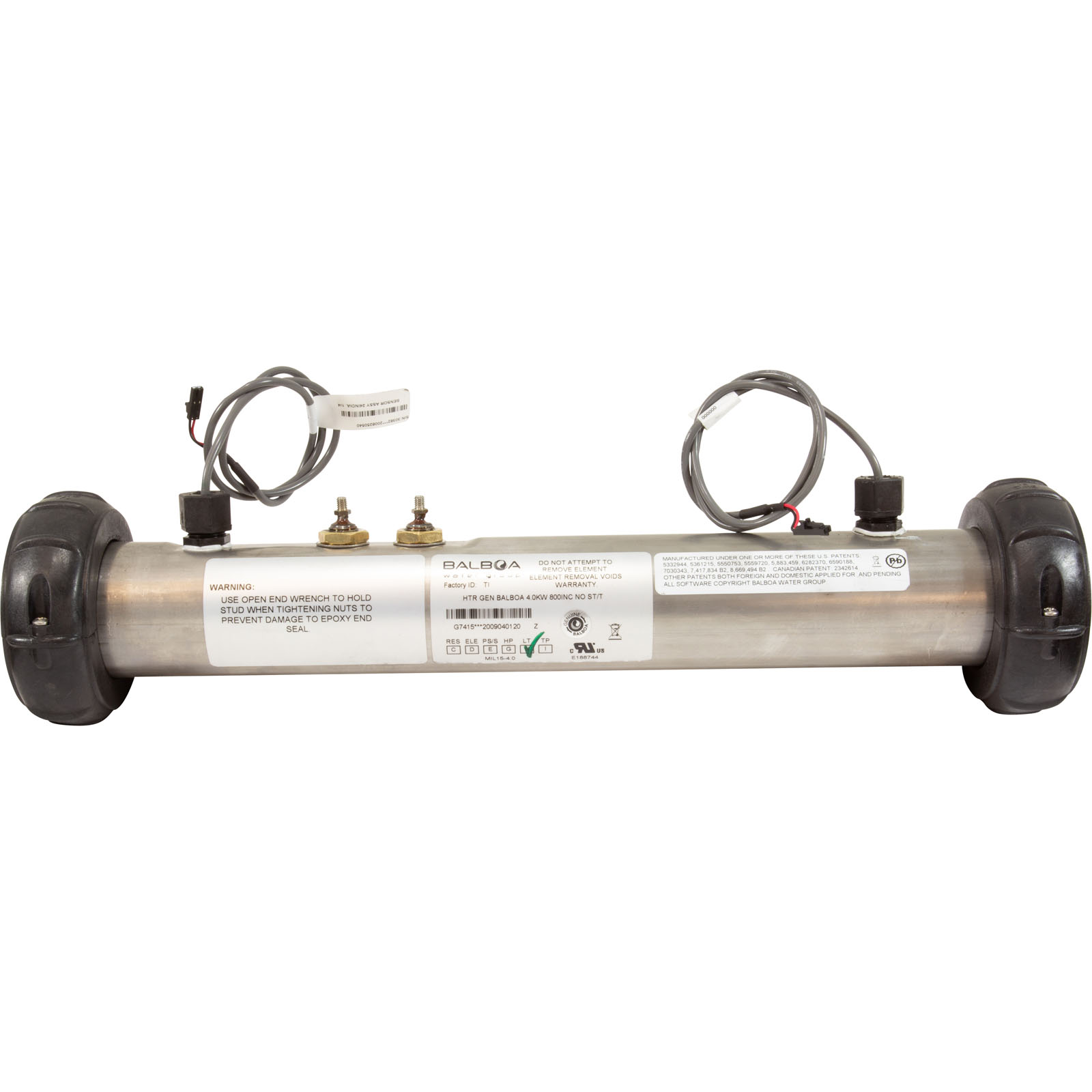 Balboa Water GroupStainless steel replacement heater assembly without mounting studs, 4.0kW/230v, 2" x 15". Includes M7™ sensors. Tailpieces and gaskets sold separately. Made for Balboa VS and Balboa SUV M7™ control systems.
