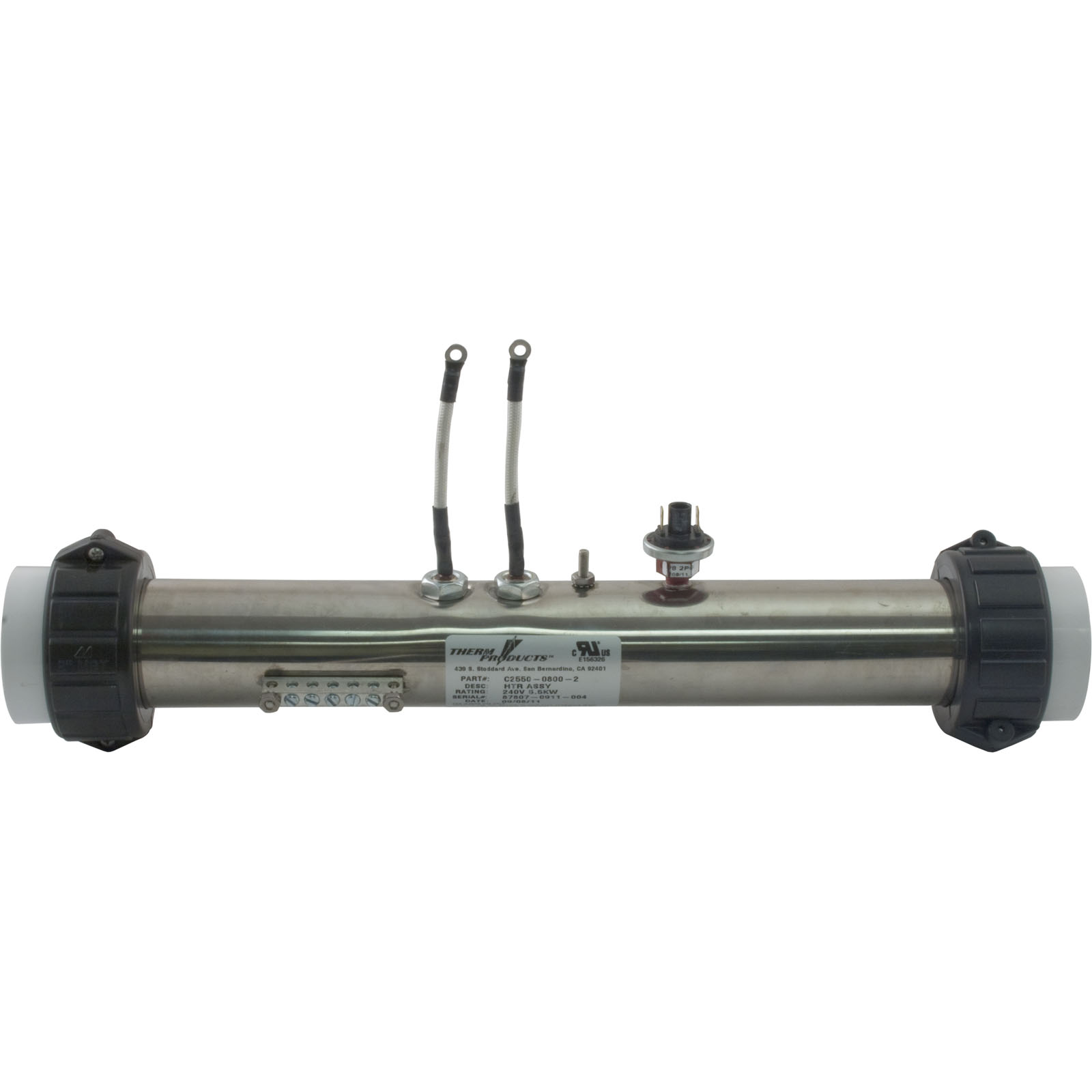 Stainless steel 2-1/4" x 15" 5.5kW/230v replacement flow thru heater with aluminum ground bar, 1/8"npt pressure switch, (1) 10-32 x 1/2" stud. 2" heater tailpieces, split nuts and gaskets included.