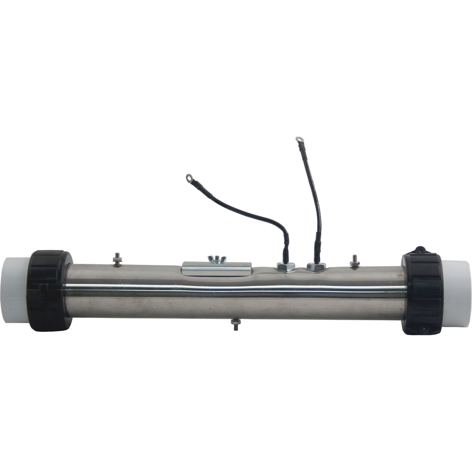 Stainless steel 5.5kW/230v, 2" x 15" flow thru replacement heater assembly. Includes a coated heater element, (2) 2" split nuts, (2) gaskets and (2) tail pieces.