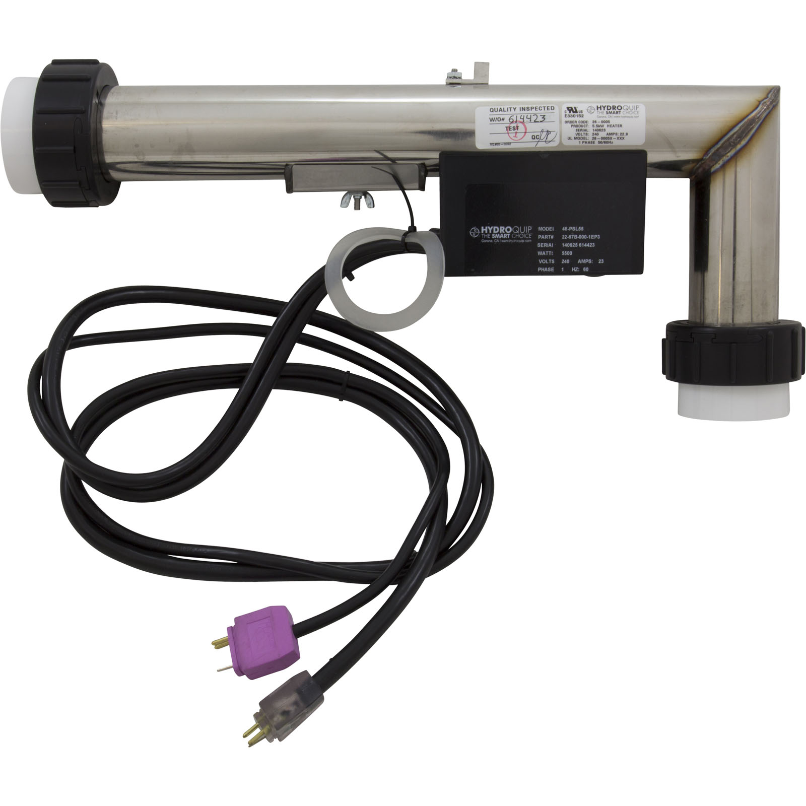 HydroQuip Platinum Series, 5.5kw 115v/230v L-shaped heater. The tube's longest length measures 17" x 2" and comes complete with a 60" cord and pressure switch. For use exclusively with the HydroQuip Platinum series electronically switched control systems featuring slide heater technology.