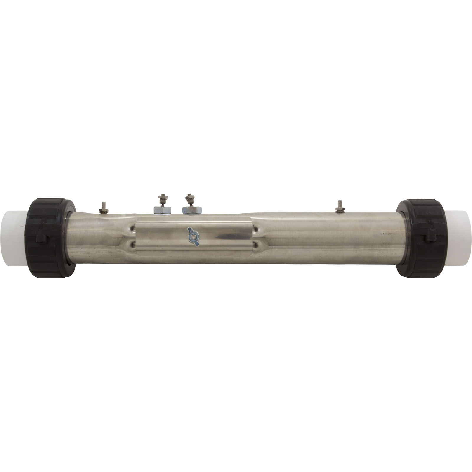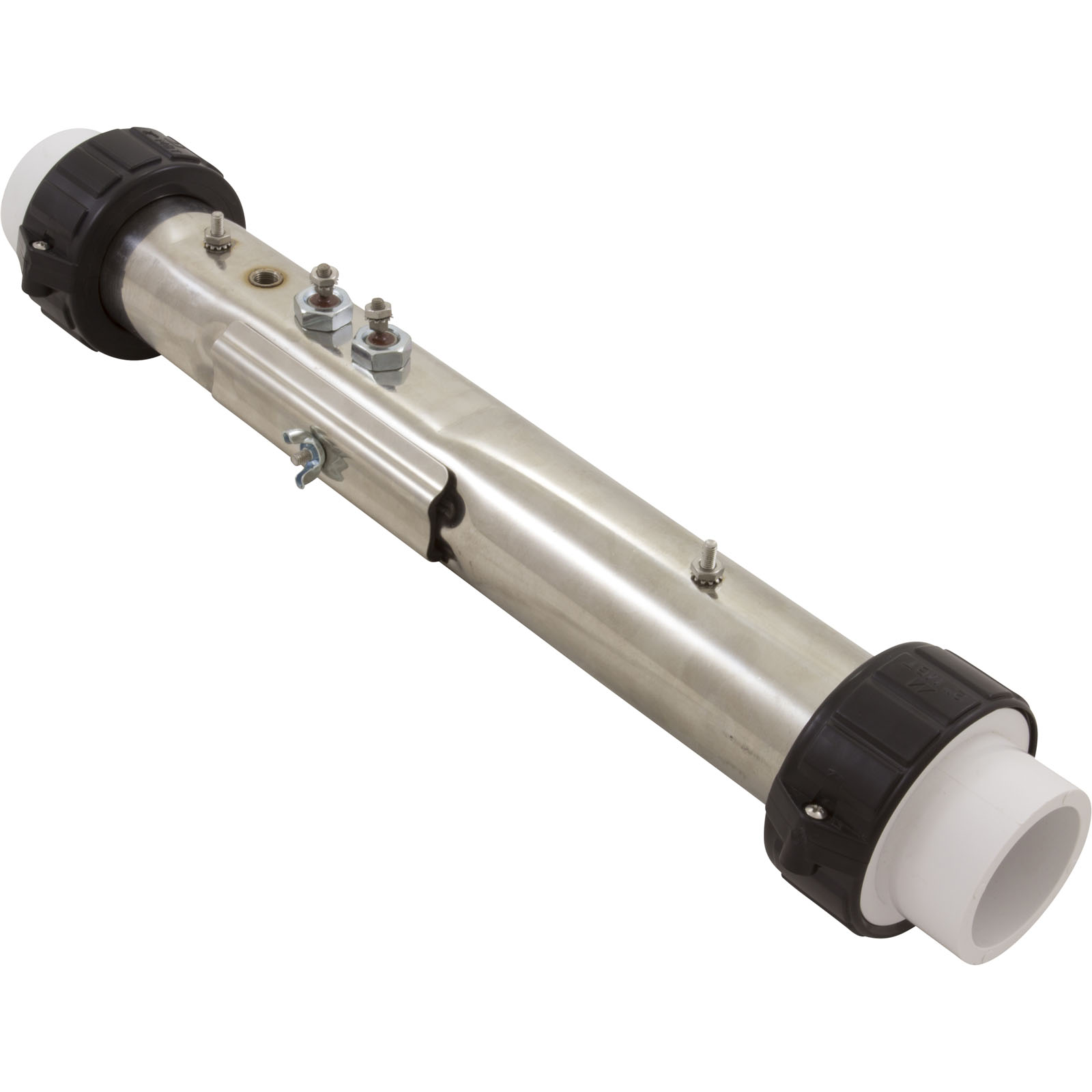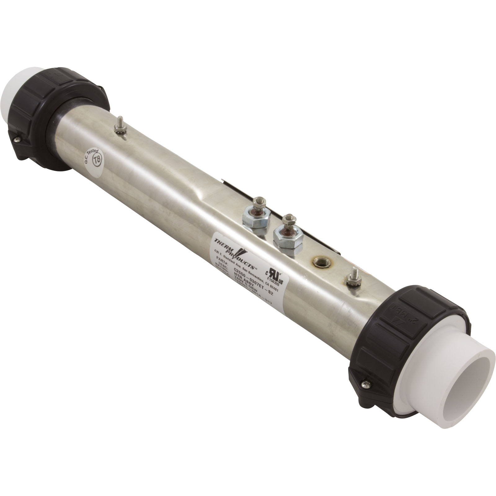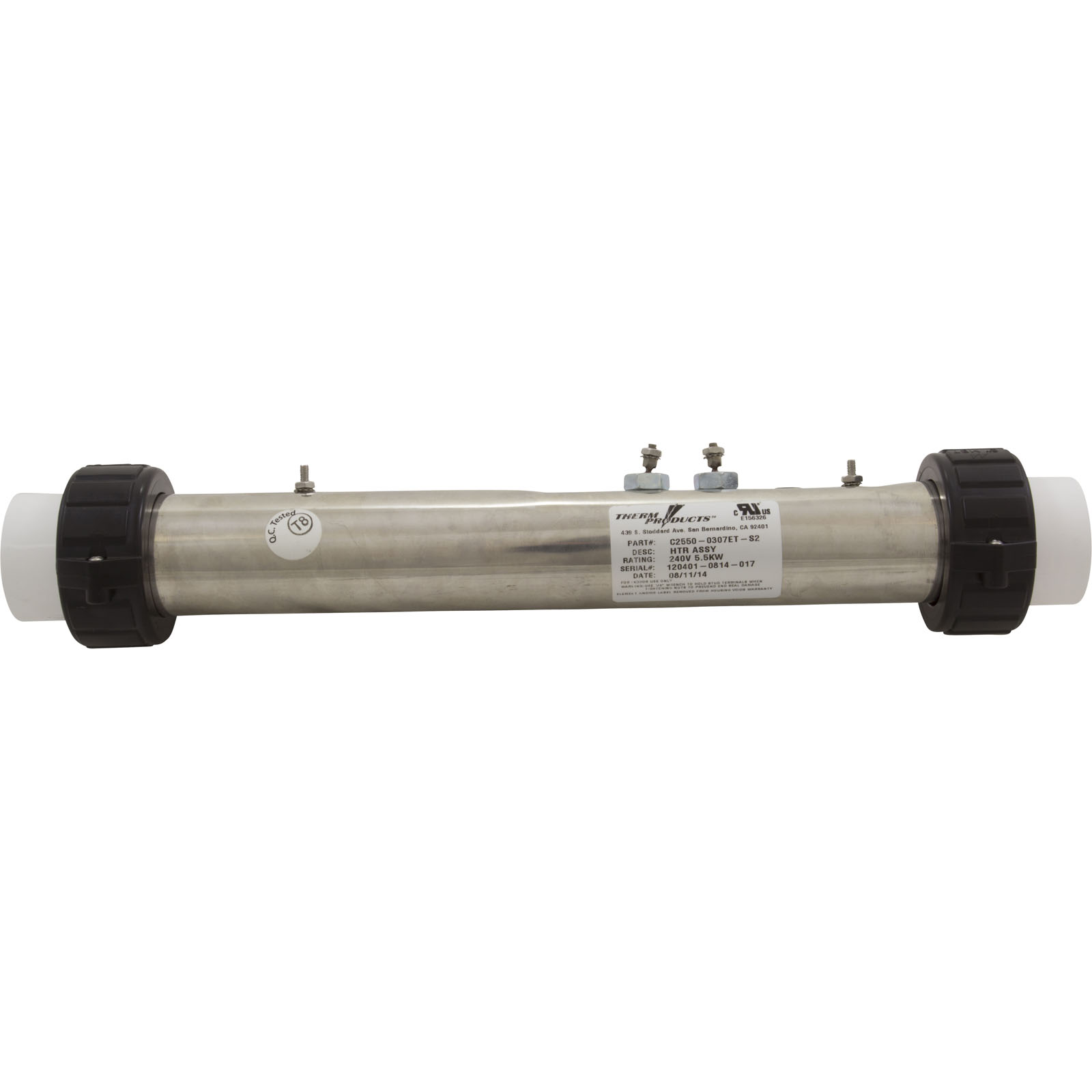 Stainless steel 2-1/4" x 15" with 5.5kW/230v element, 1/8"npt pressure switch tap, dual groove thermal well cover, and (2) 10-32 x 3/8" mounting stud. Order tailpieces separately.