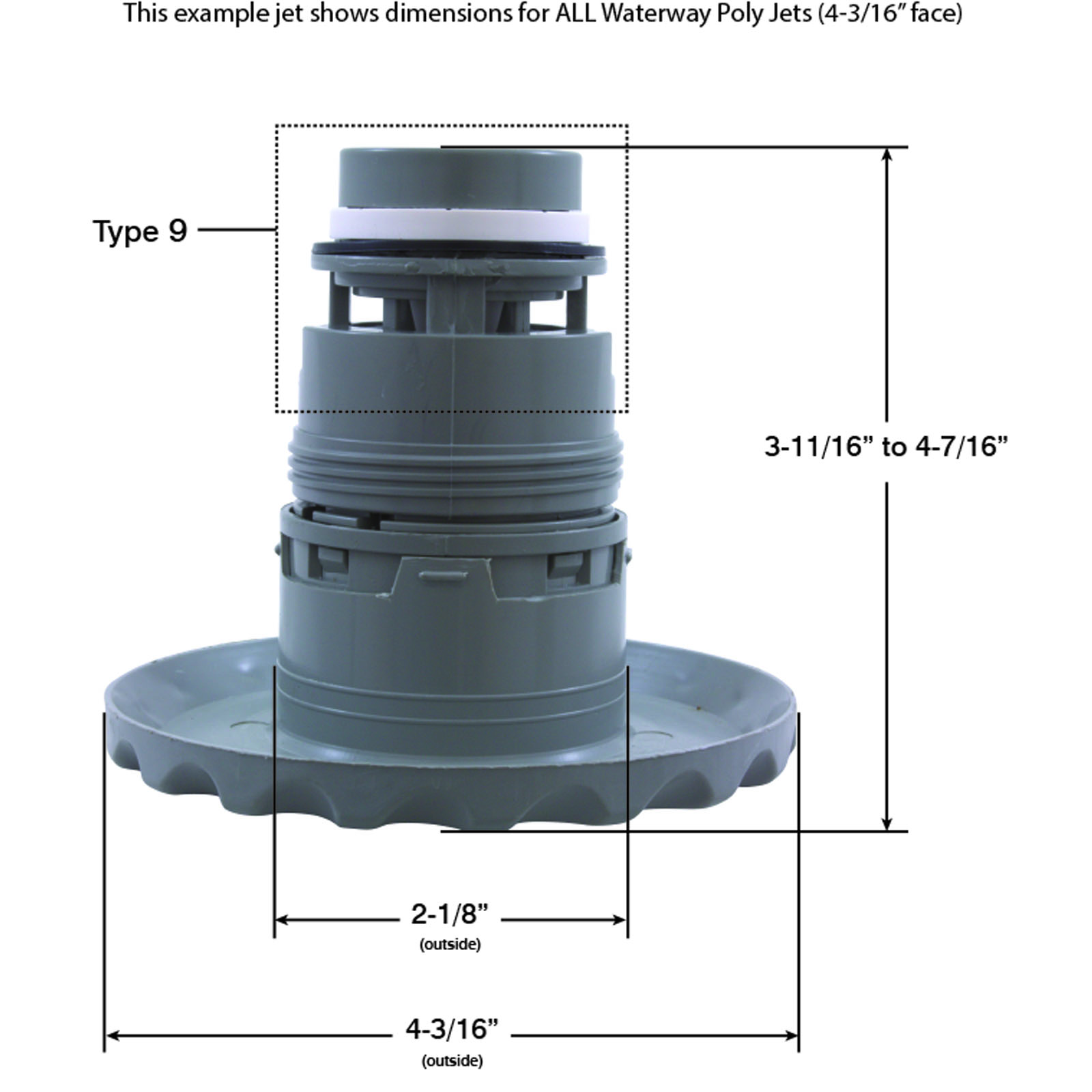 Jet Internal, Waterway Poly Jet. Gray, 4-3/16" Deluxe Scalloped face, with Directional style internal and Adjustable on/off control. Available in additional colors and styles.