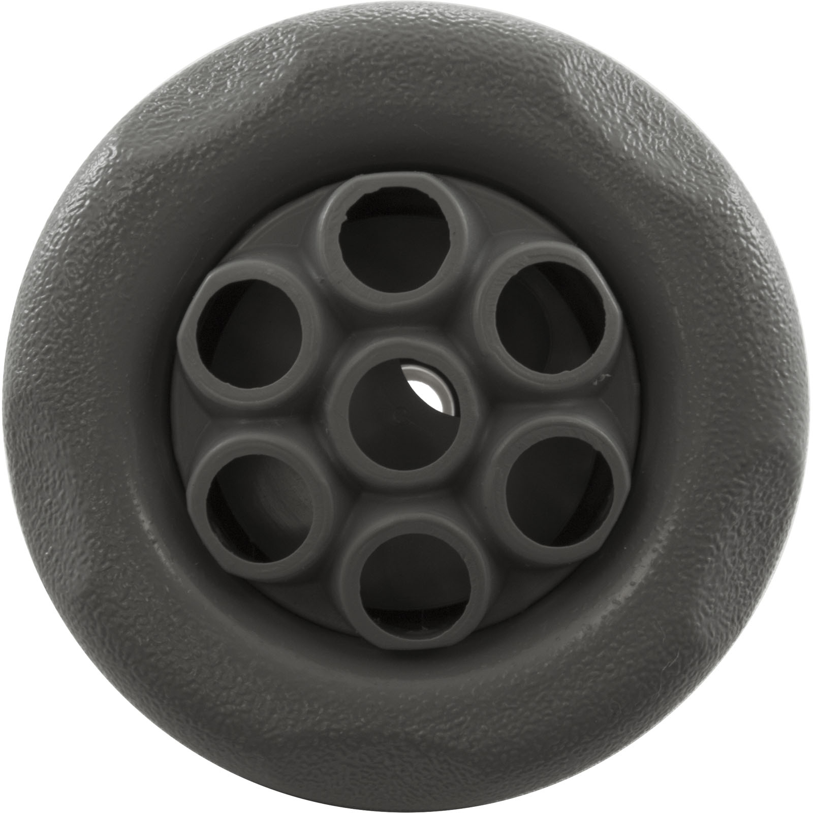 Jet Internal, Waterway Poly Storm with Thread-In diffuser. Gray, 3-3/8" Textured Scalloped face, with Massage style internal and Adjustable on/off control. Available in additional colors and styles.