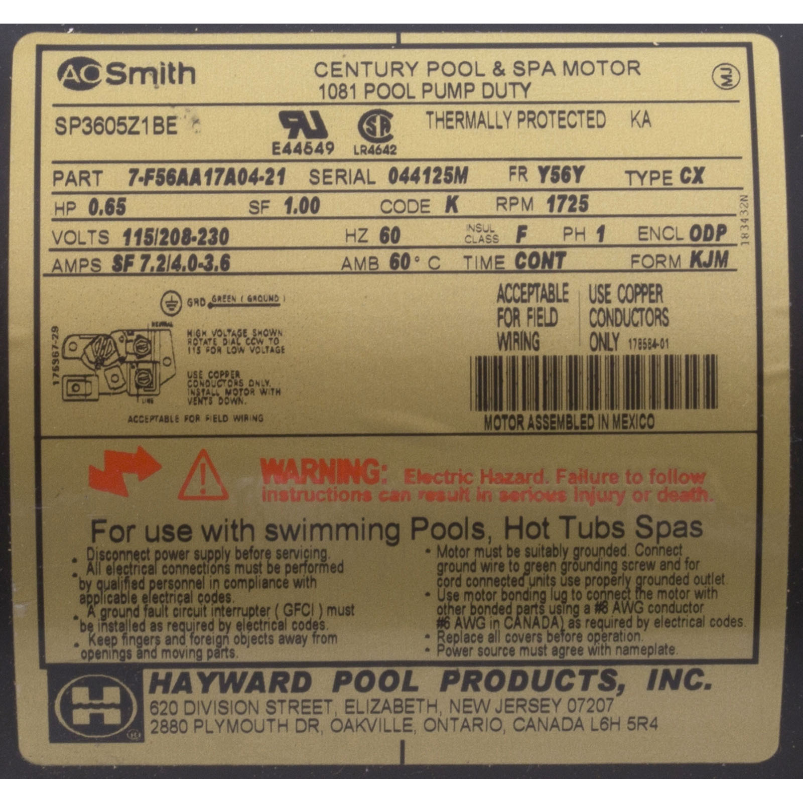 SPX3605Z1BER Motor AO Smith.65hp115v/208v-230v1-SpdTristar Waterfall