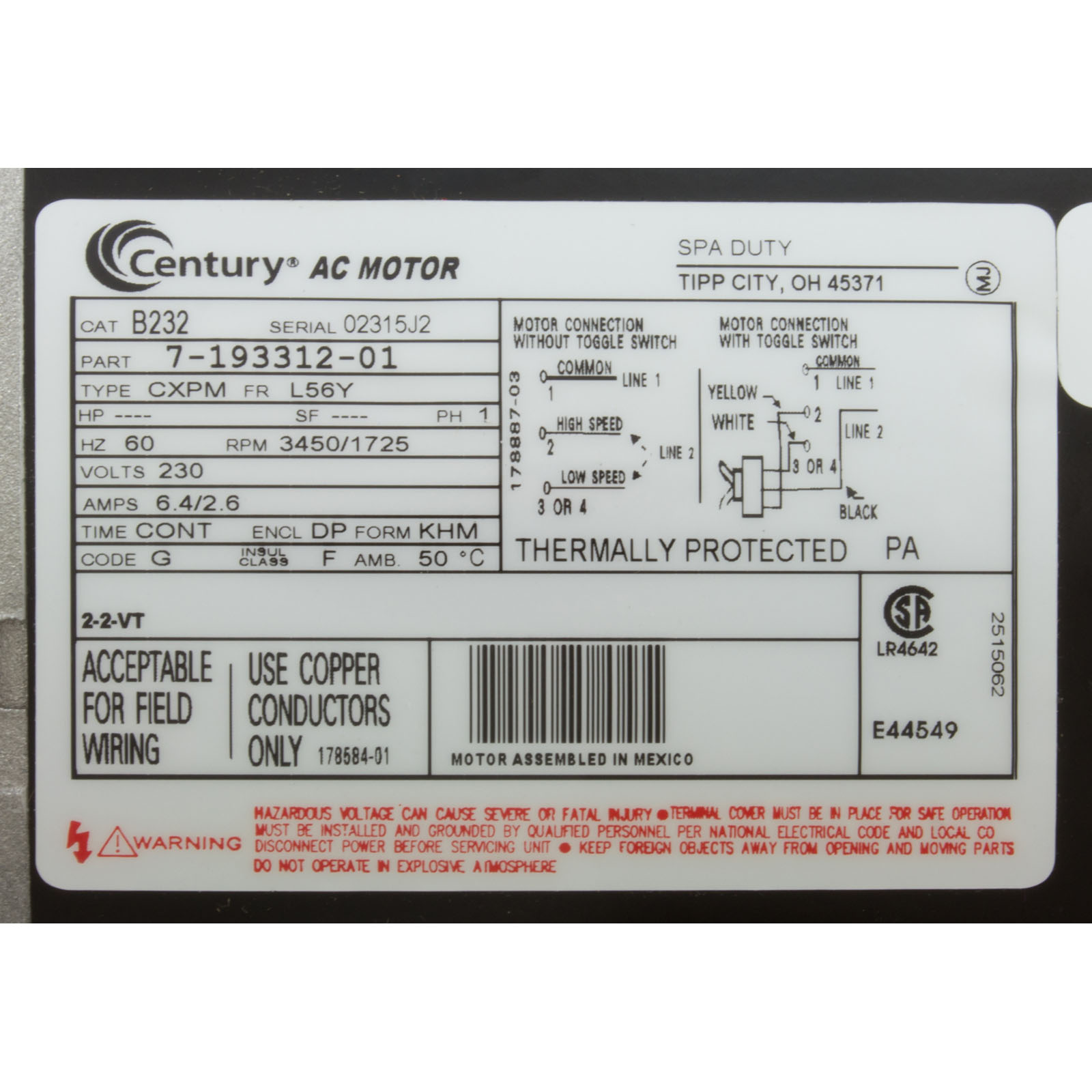 B232 Motor Century 1.0 Horsepower 230v 2 Speed 56 Y Frame