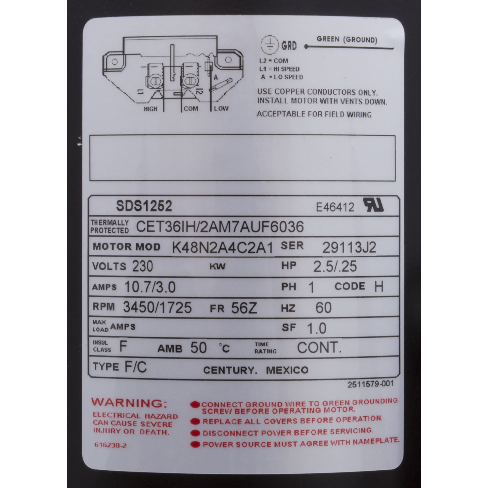 SDS1252 Motor Century 2.5 Horsepower 230v 2 Speed 48 Frame