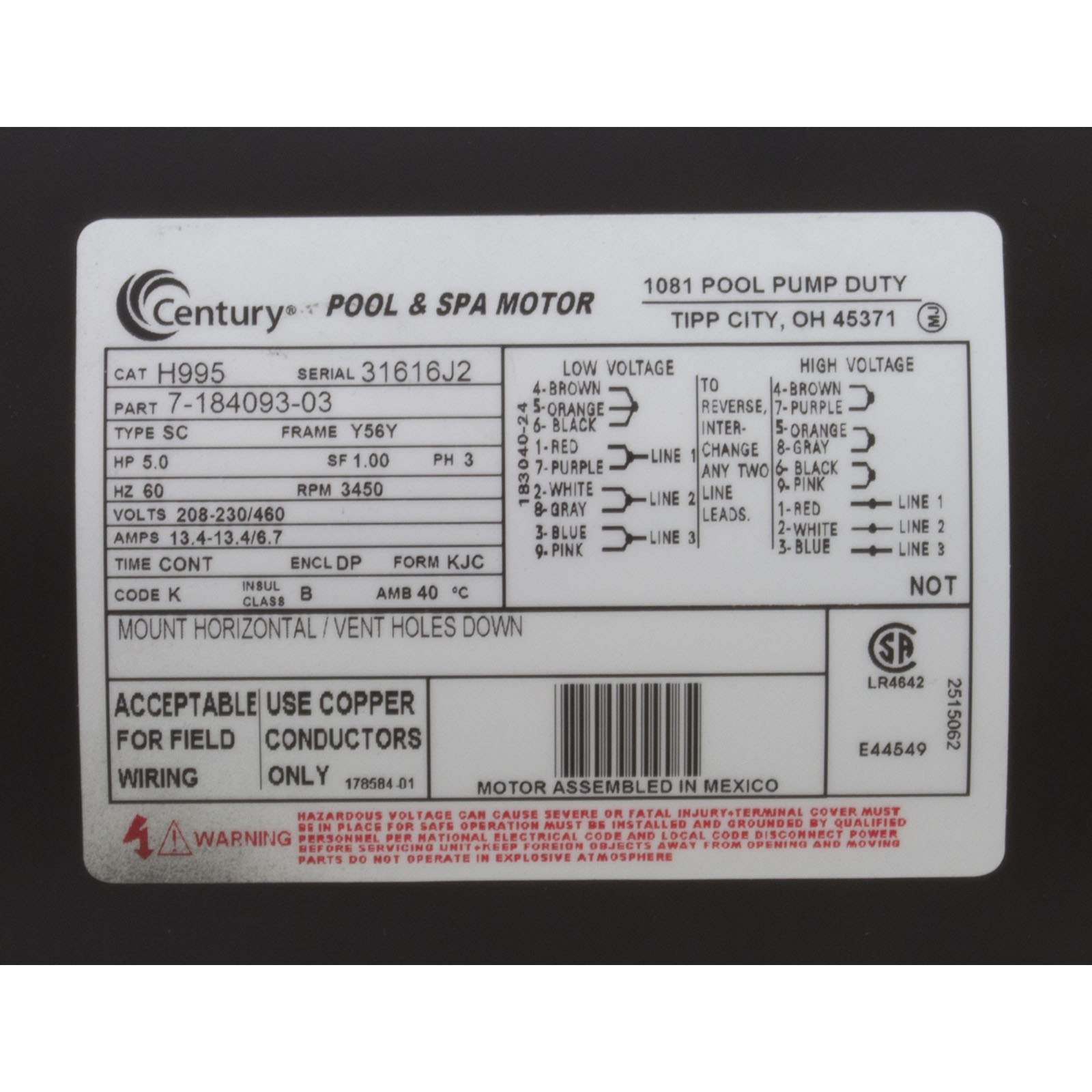 H995 Motor Century 5.0hp 208-230v/460vSQFL56Y Frame3 PhThd