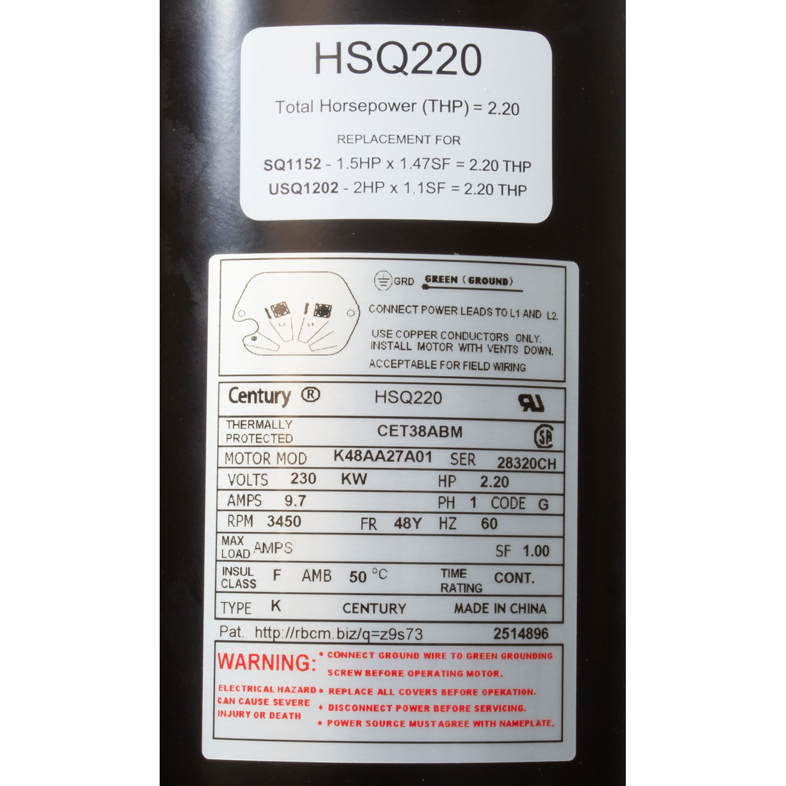 HSQ220 Swimming Pool Replacment Motor Century Cent PRO 2.2hp 230v 1-Spd SQFL48Yfr Thd