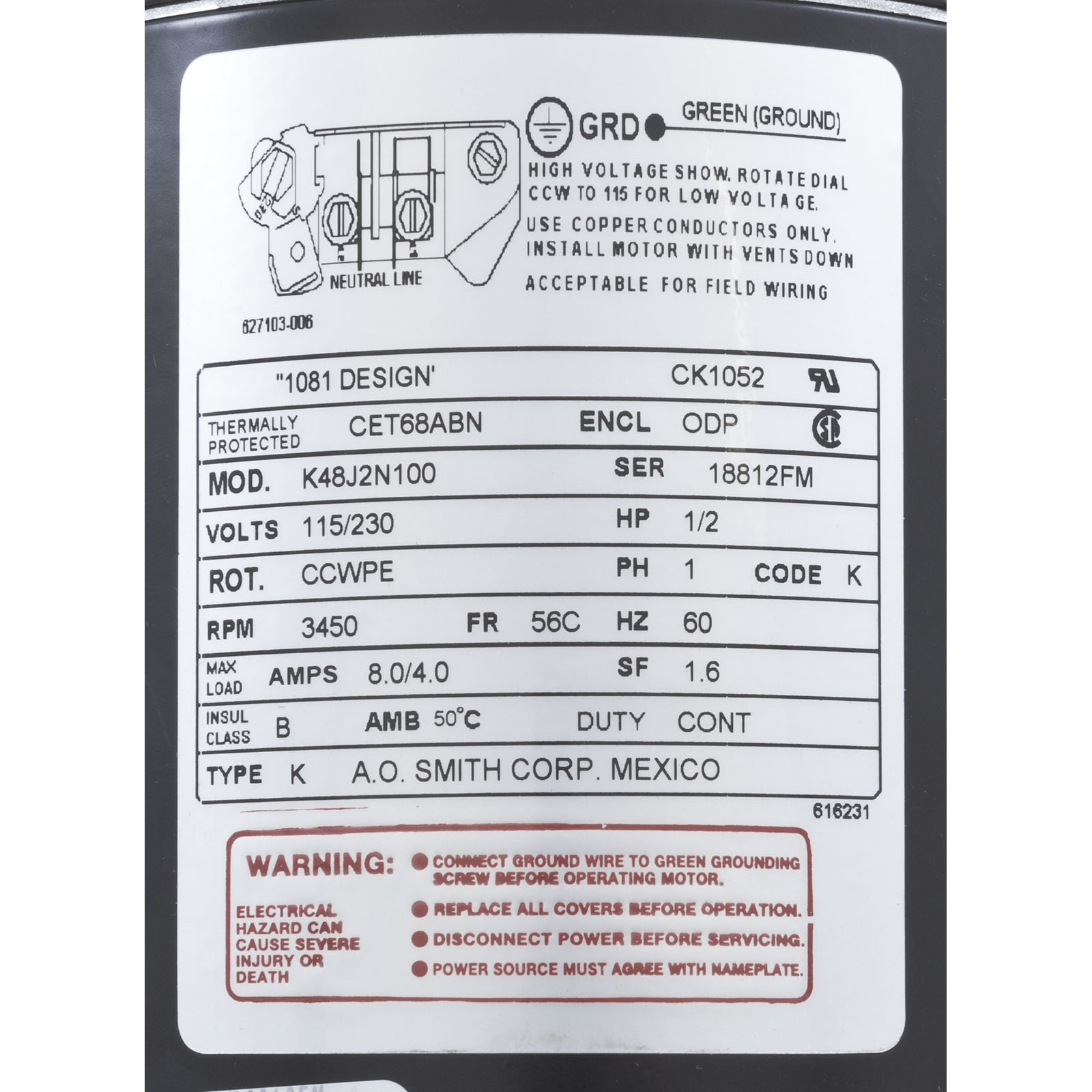 CK1052 Motor Century0.5hp115v/230v1-Spd48frC-Face Key EE
