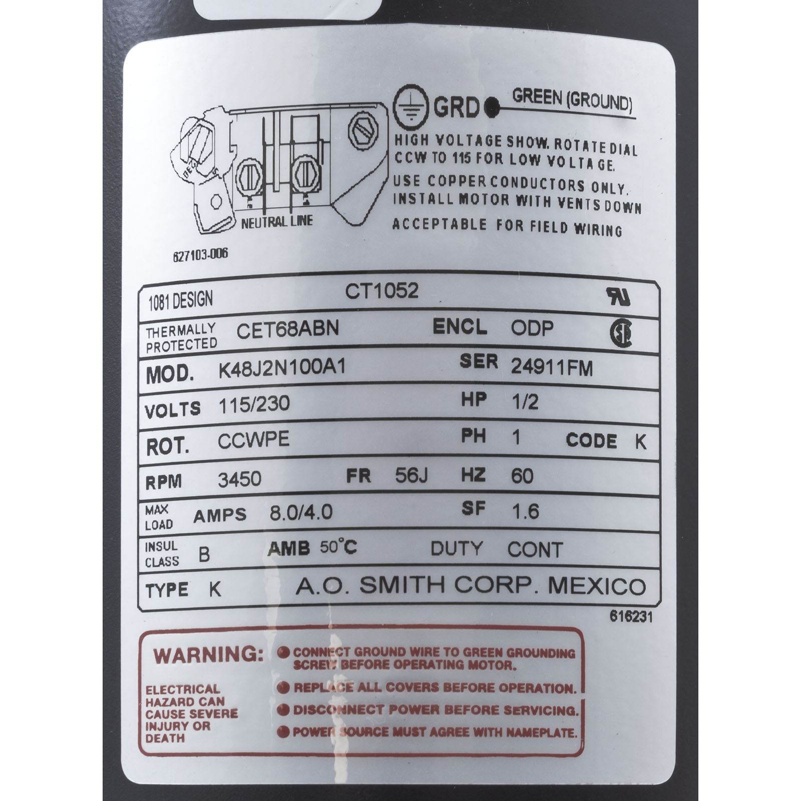 CT1052 Motor Century0.5hp115v/230v1-Spd56CfrC-Face ThdEE
