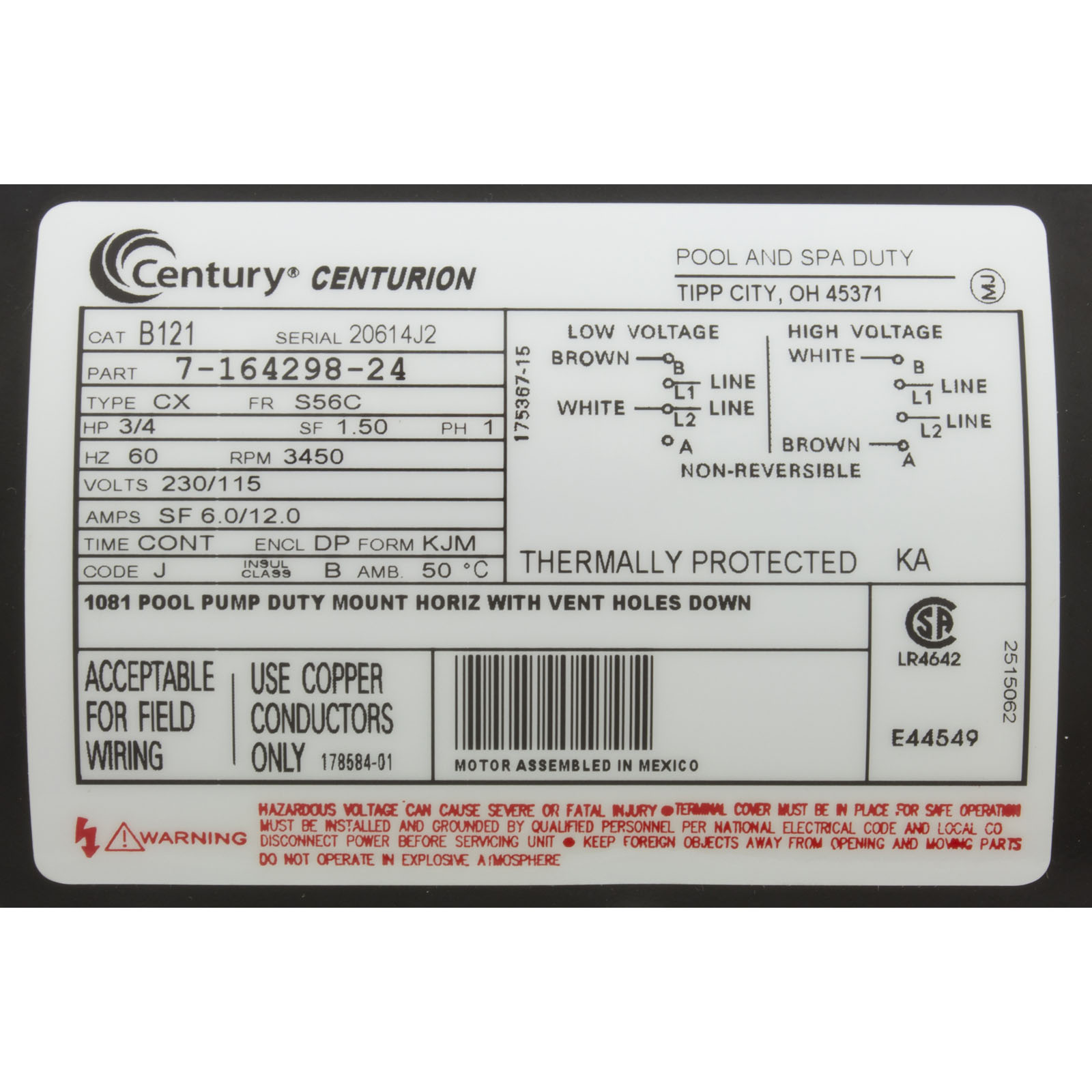 Motor, Century,0.75hp,115v/230v,1-Spd,56Cfr,C-Face Key