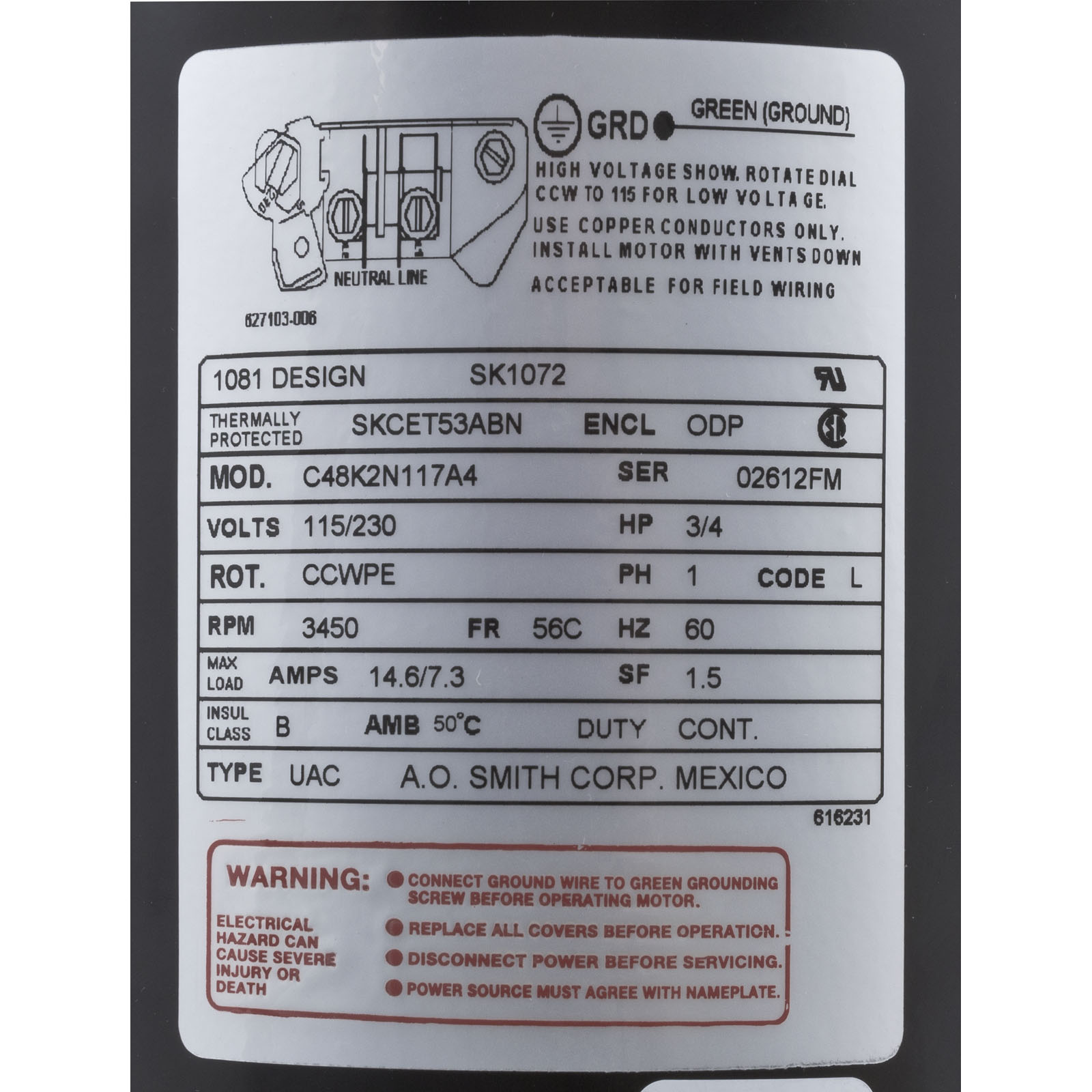 SK1072 Motor Century0.75hp115v/230v1-Spd56CfrC-Face Key