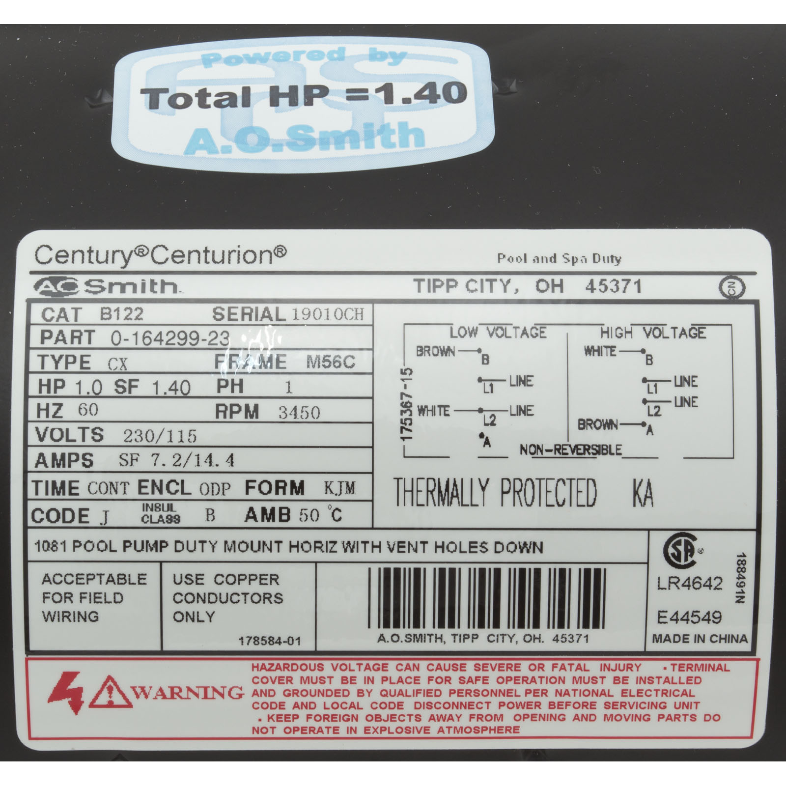 Motor, Century,1.0hp,115v/230v,1-Spd,56Cfr,C-Face Key