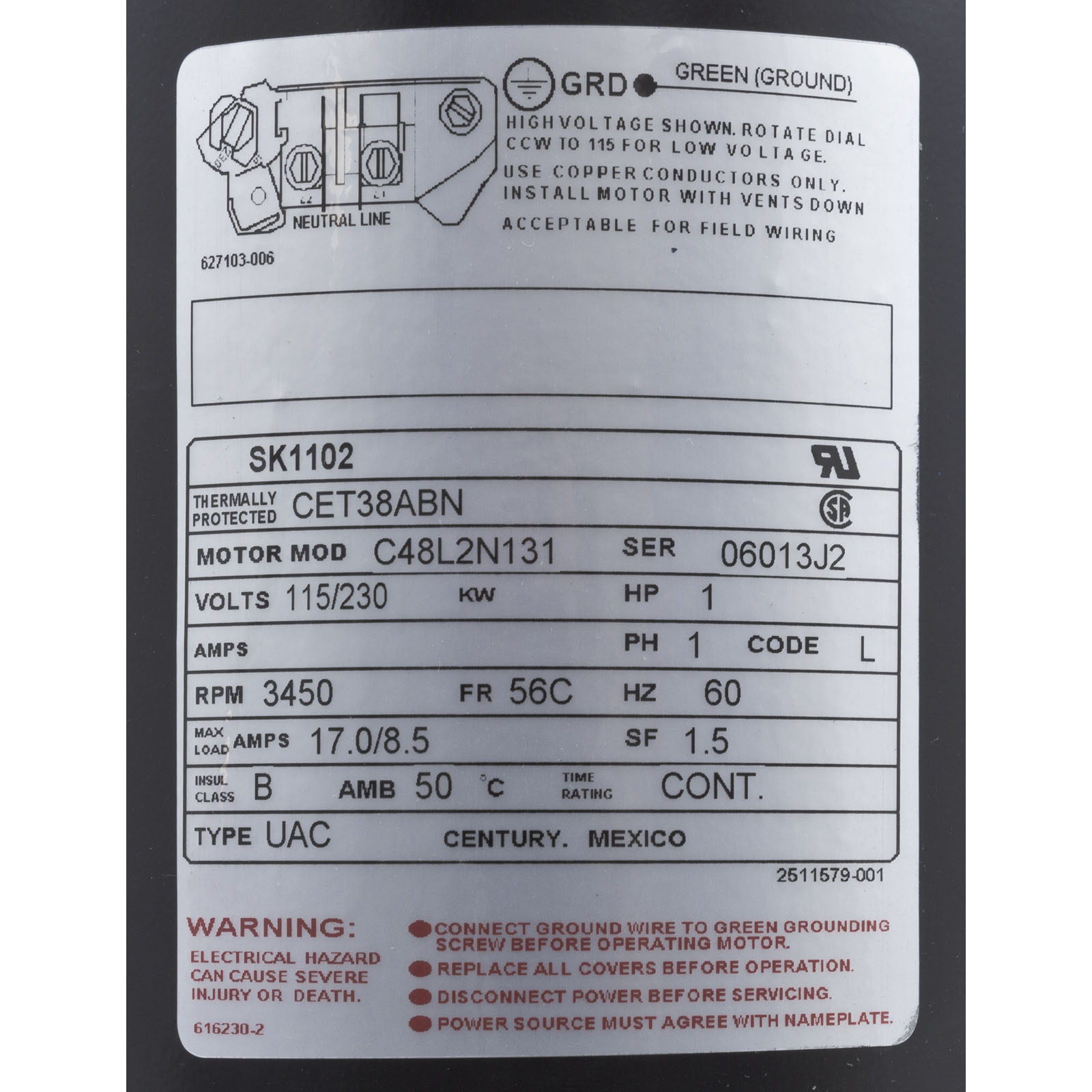 SK1102 Motor Century1.0hp115v/230v1-Spd56CfrC-Face Key