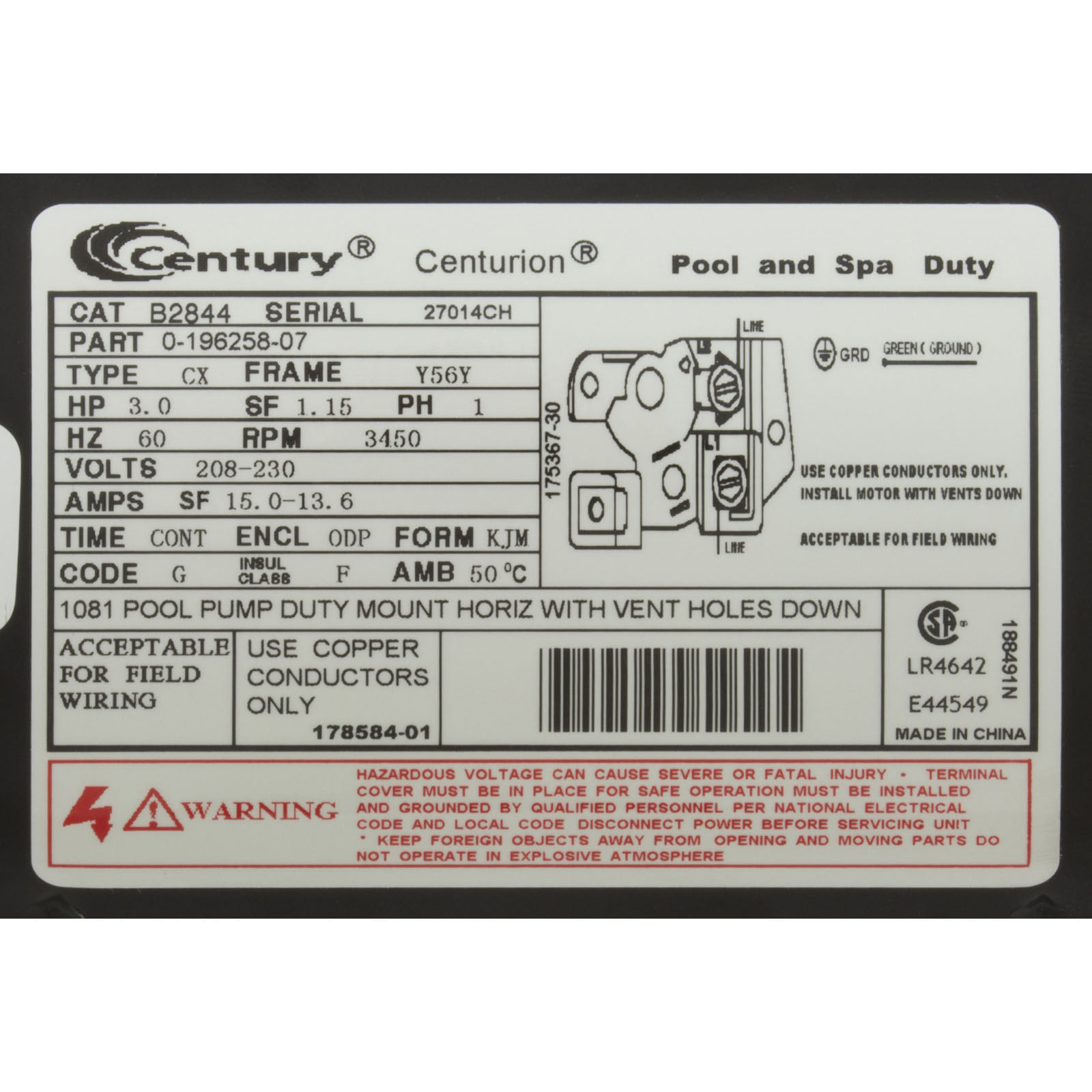 B2844 Motor Century3.0hp208v-230v1-Spd56Yfr SQFLEE