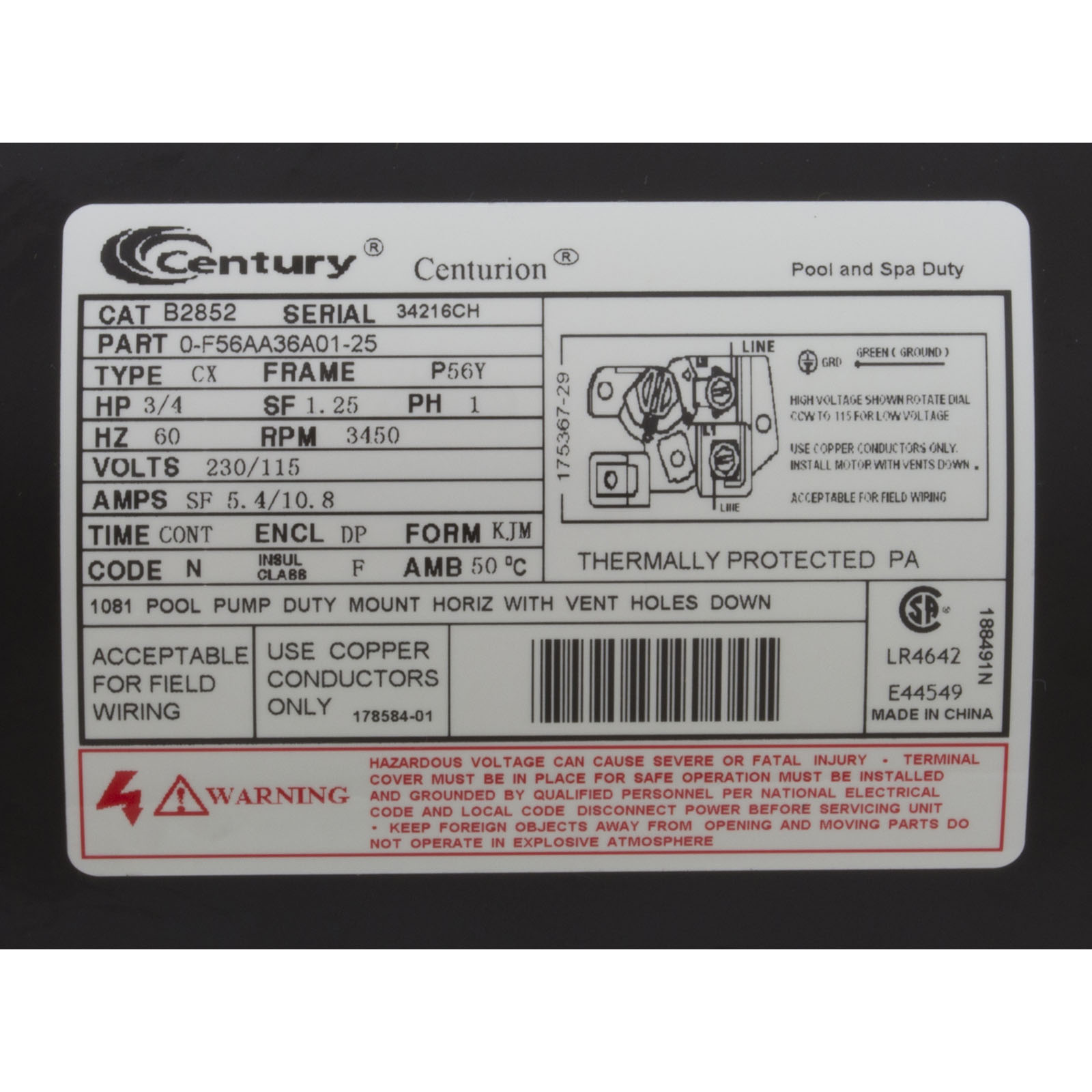 Motor, Century/WW, 0.75hp, 115v/230v, 1-Spd, 56Yfr, SQFL