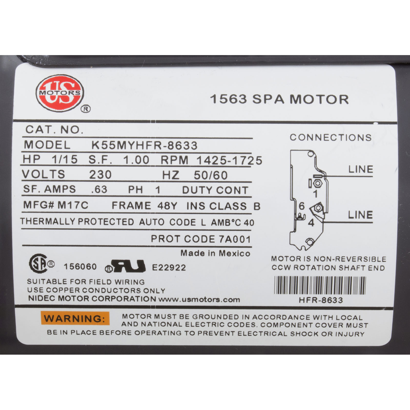 Motor, Circ, US Motor/WW, 1/15hp, 230v 1-Spd, 48fr