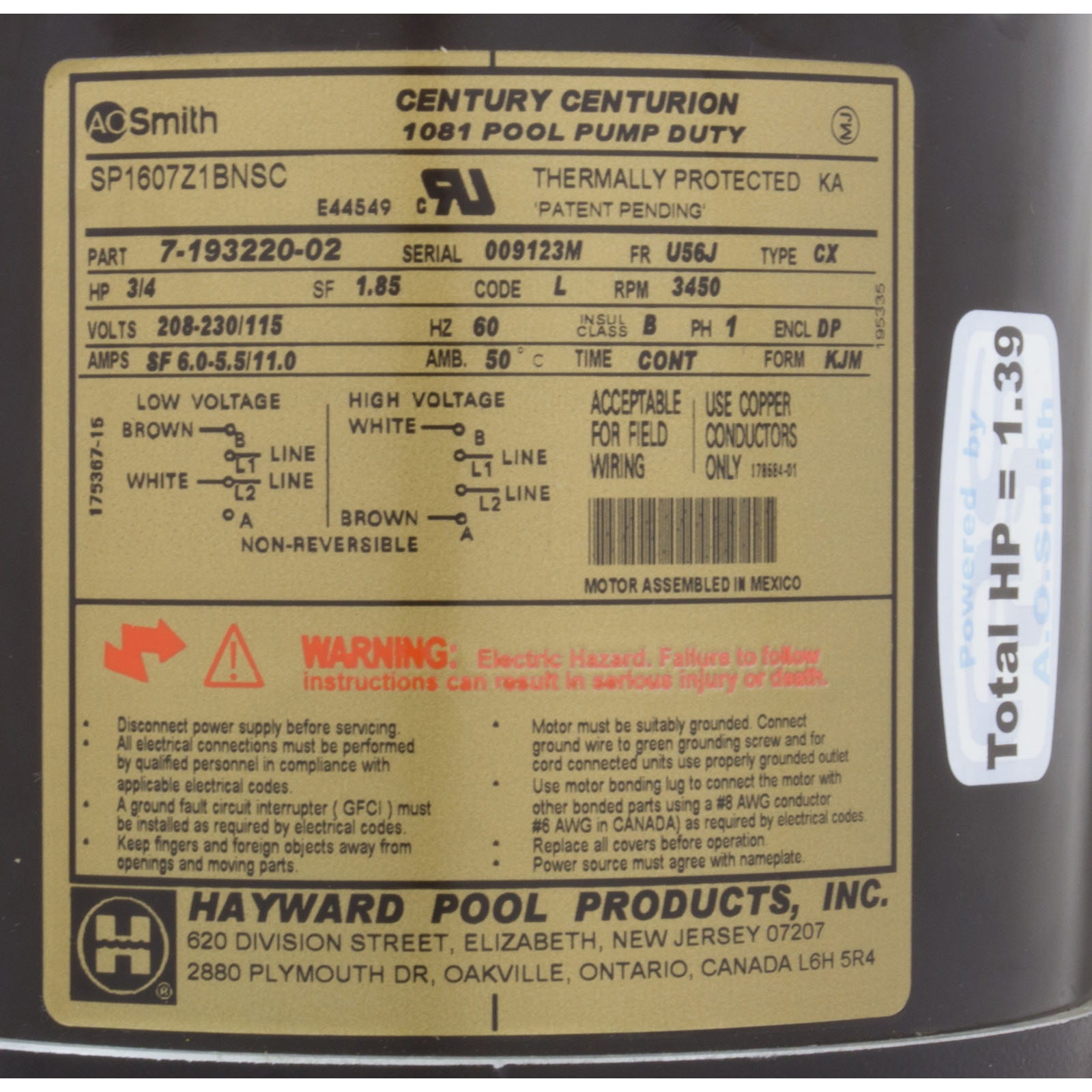 Motor, Hayward NorthStar, 0.75hp, Full Rate