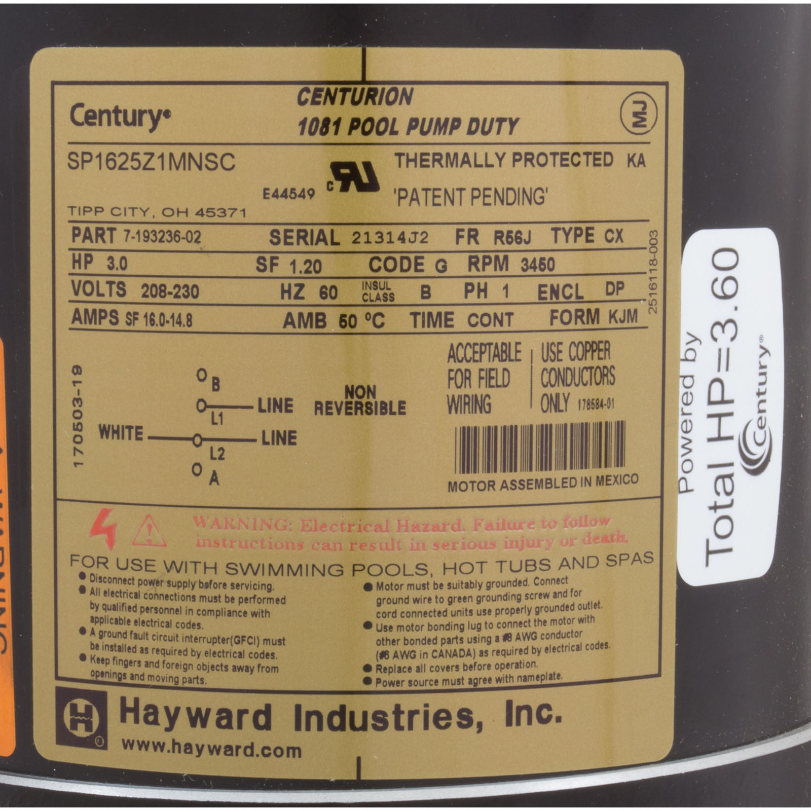 SPX1625Z1MNS Motor Hayward NorthStar 3.0hp 1-Spd 208-230v Up Rated