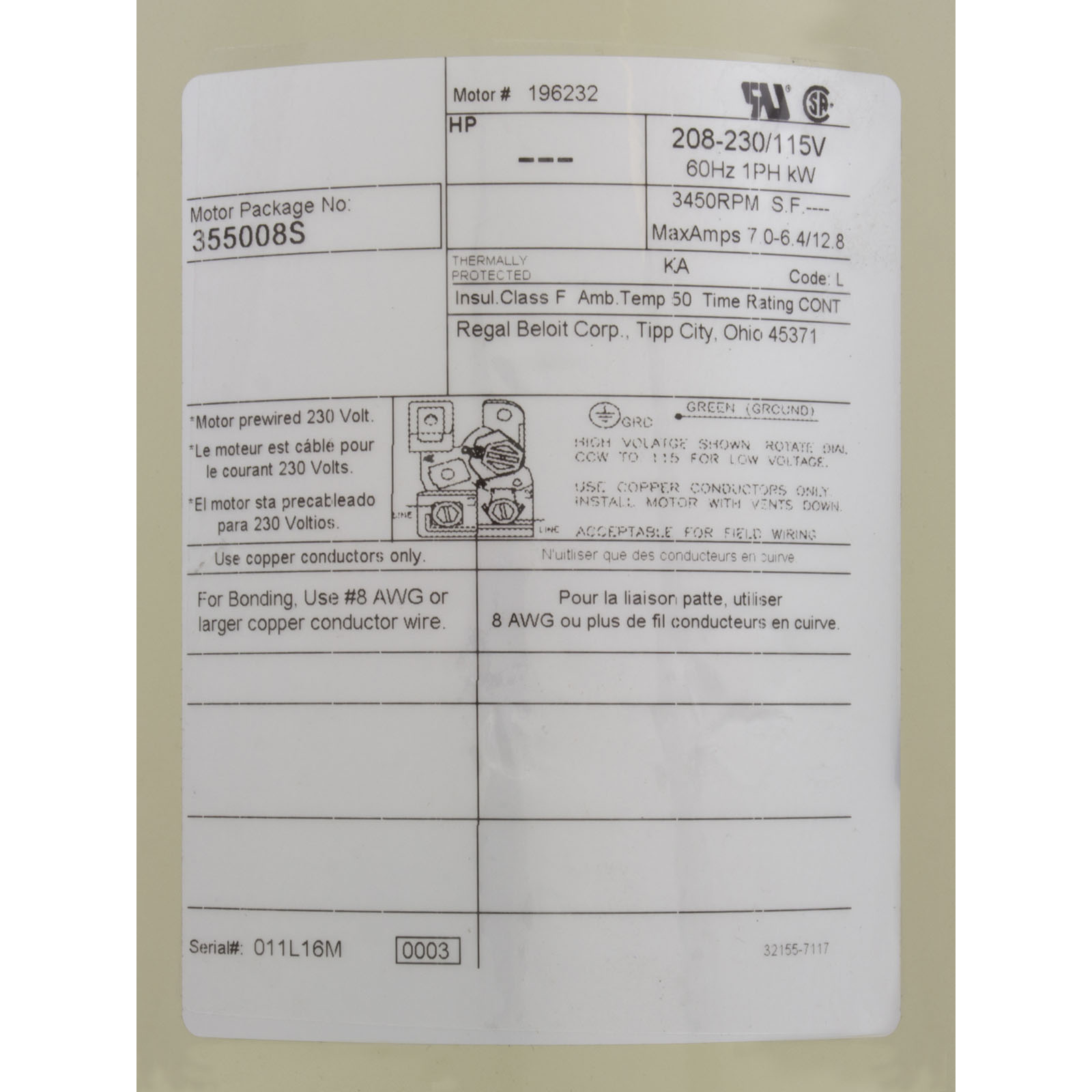 355008S Motor Pentair SF/WF0.75hp115/208-230v1-SpdSQFLEEFull