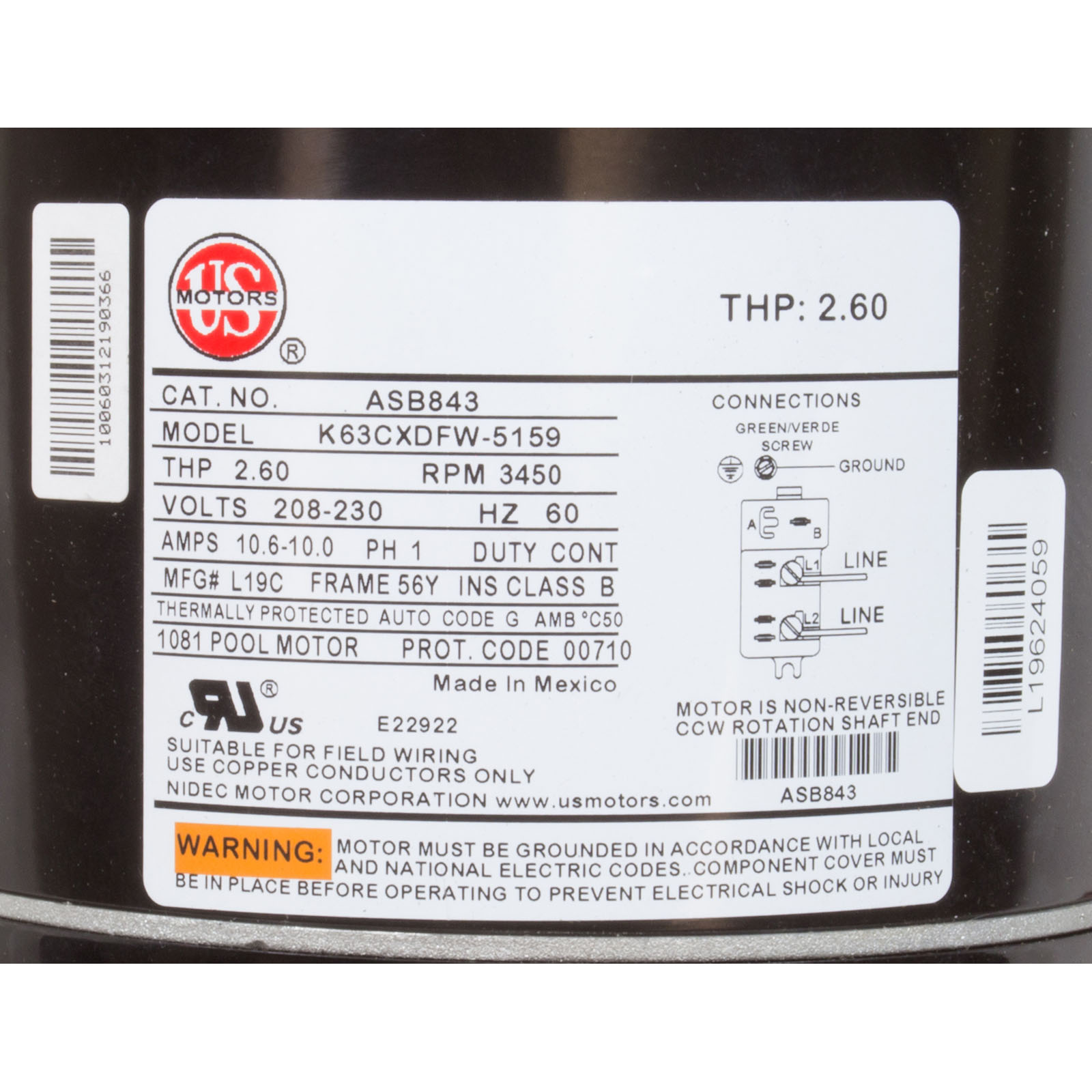 ASB843 Motor US Motor 2.0hp 208-230v 56YFr SQFL Full PE