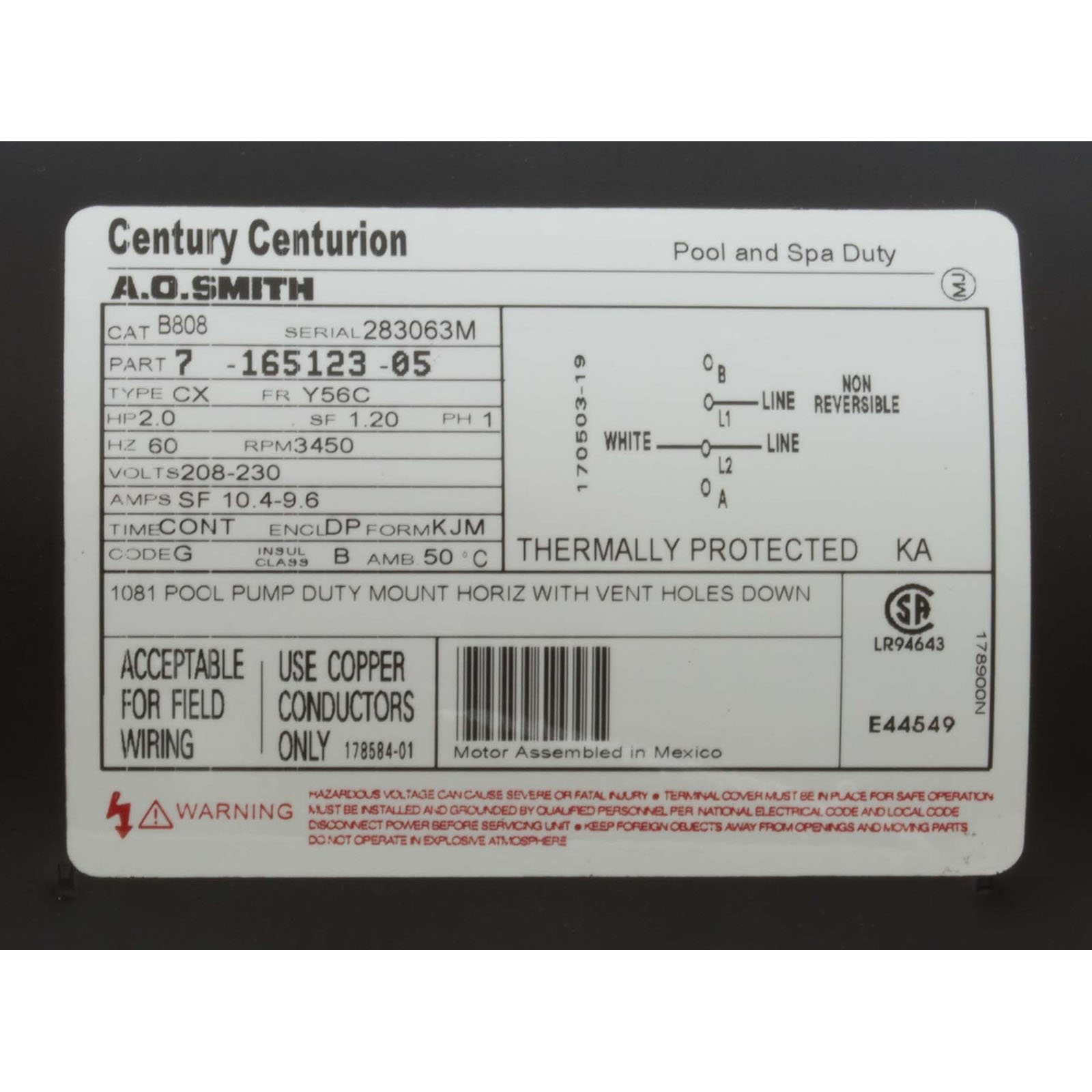 Motor,Century,2.0hp,208v-230v,1-Spd,56Cfr,C-Face Key,EE