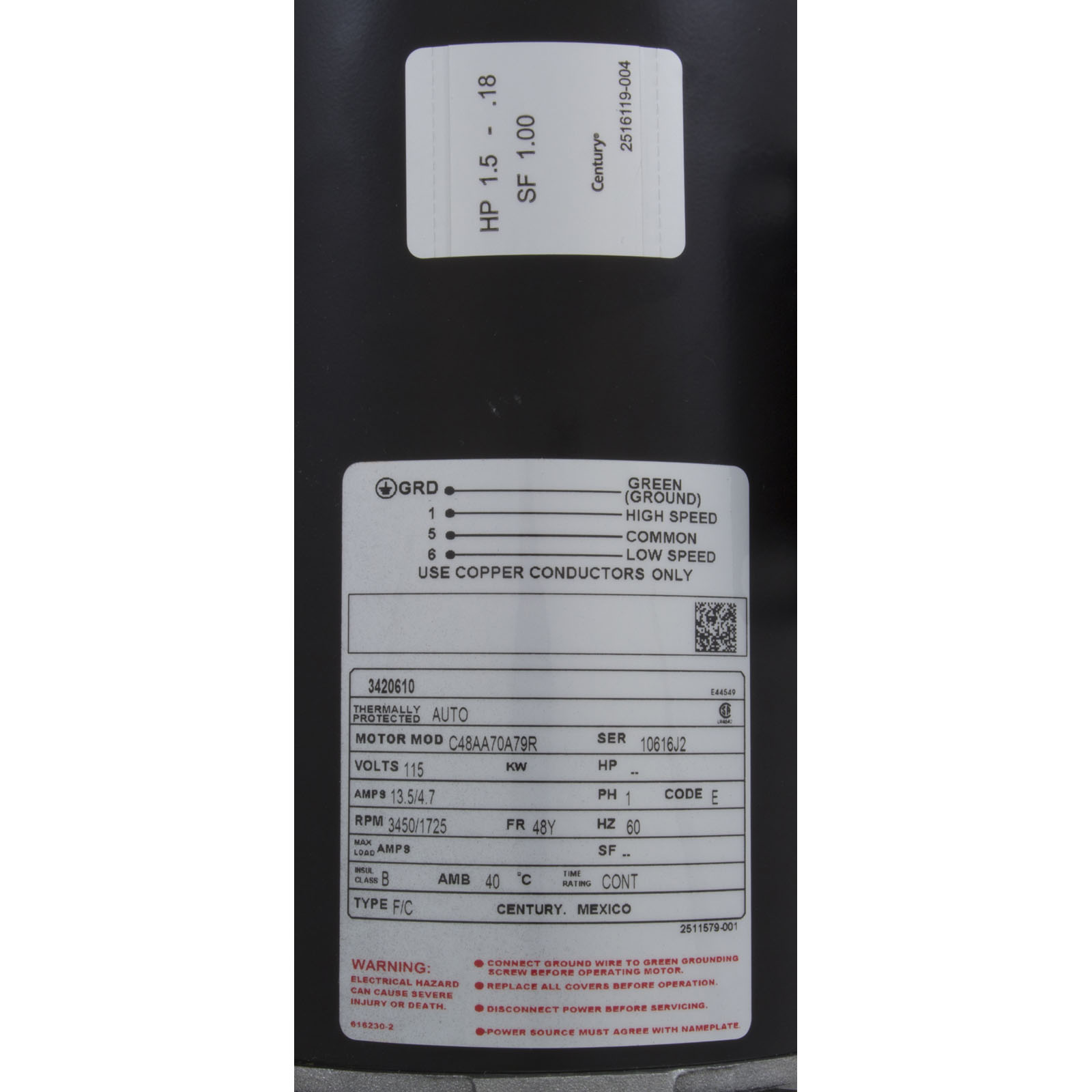 35-126-1115W - Motor, Century/WW, 1.5hp, 115v, 2-Speed, 48 Frame