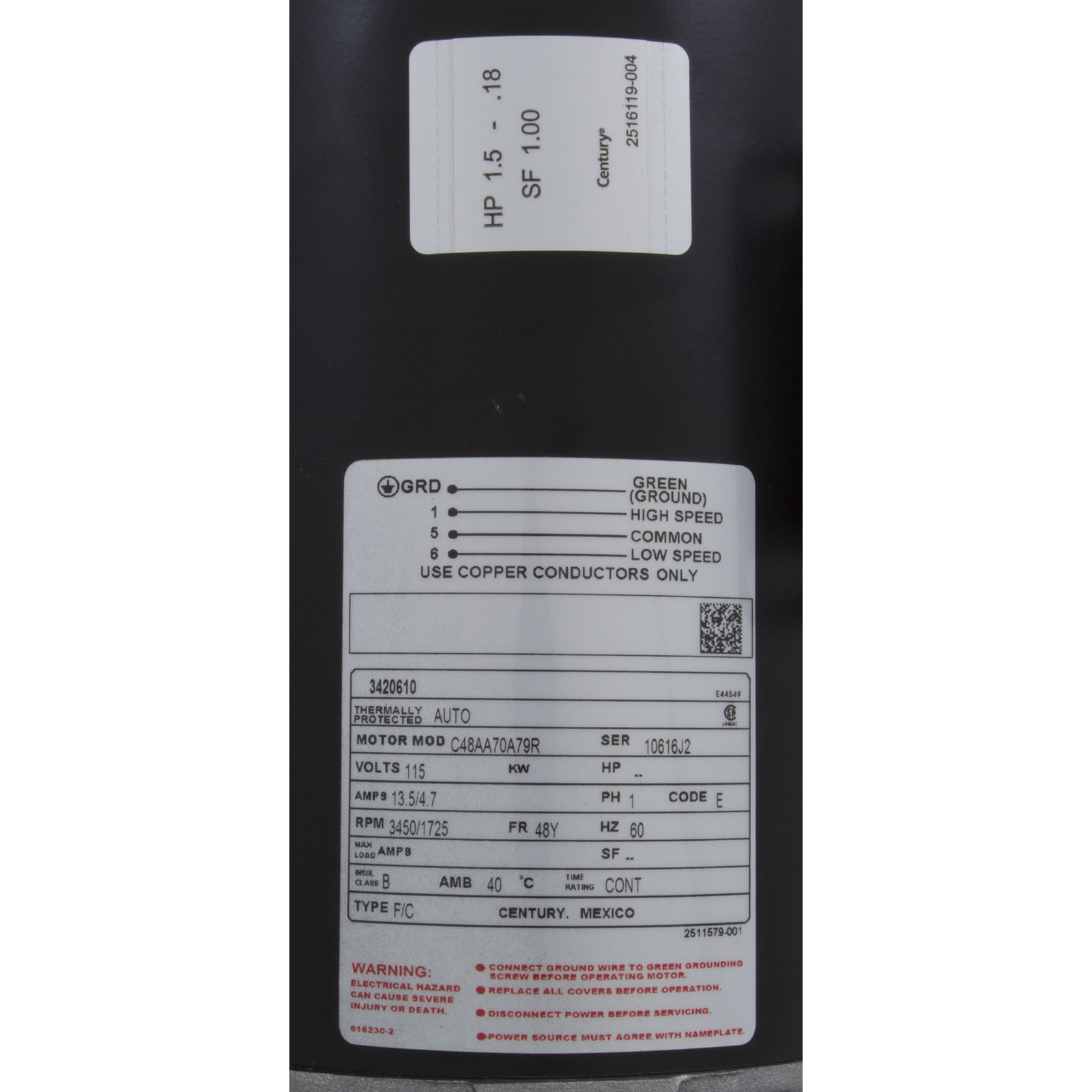 35-126-1115W - Motor, Century/WW, 1.5hp, 115v, 2-Speed, 48 Frame