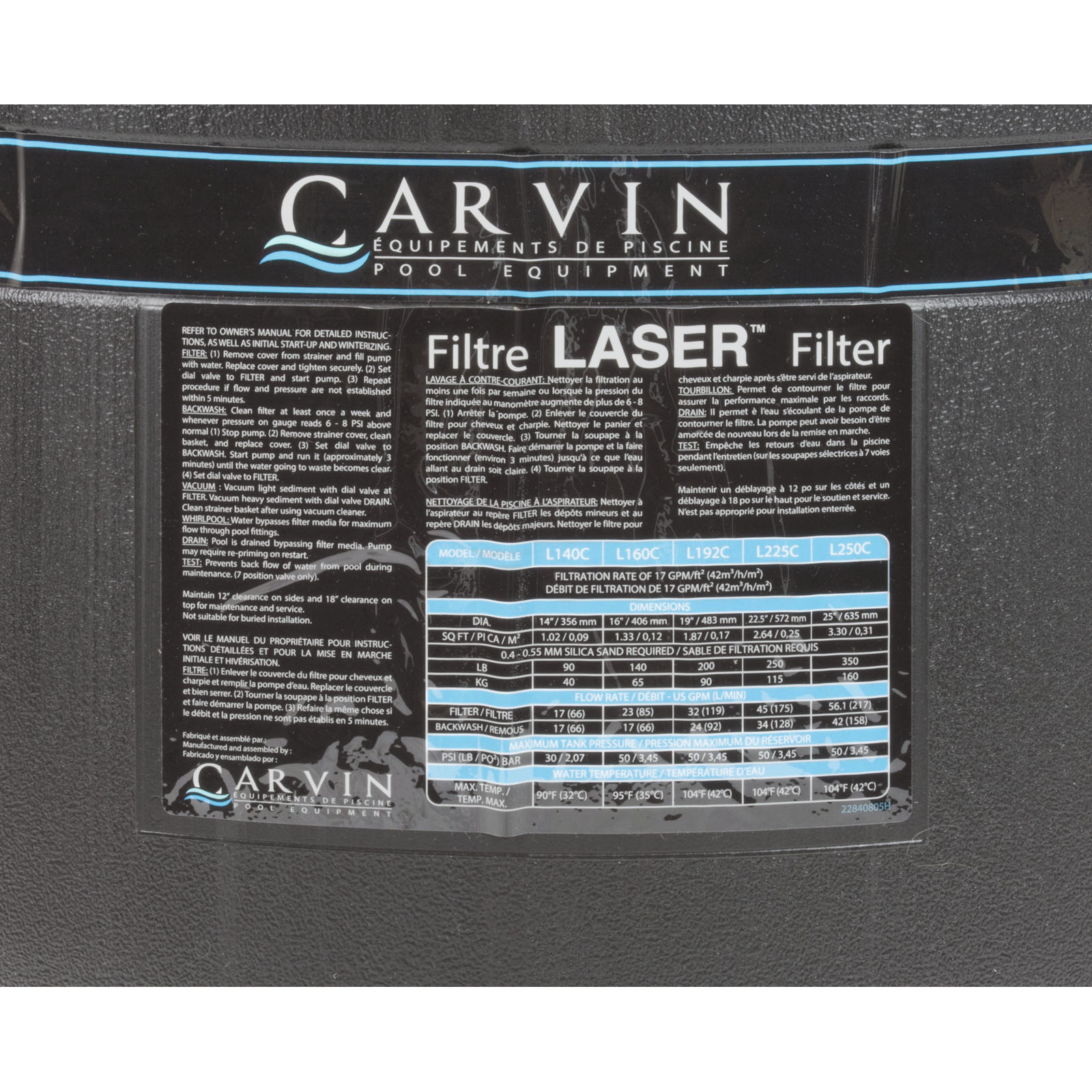 Model L250C-7C Laser Series Sand Pool Filter by Carvin Pool Equipment for In-Ground and Above-Ground PoolsFEATURES: