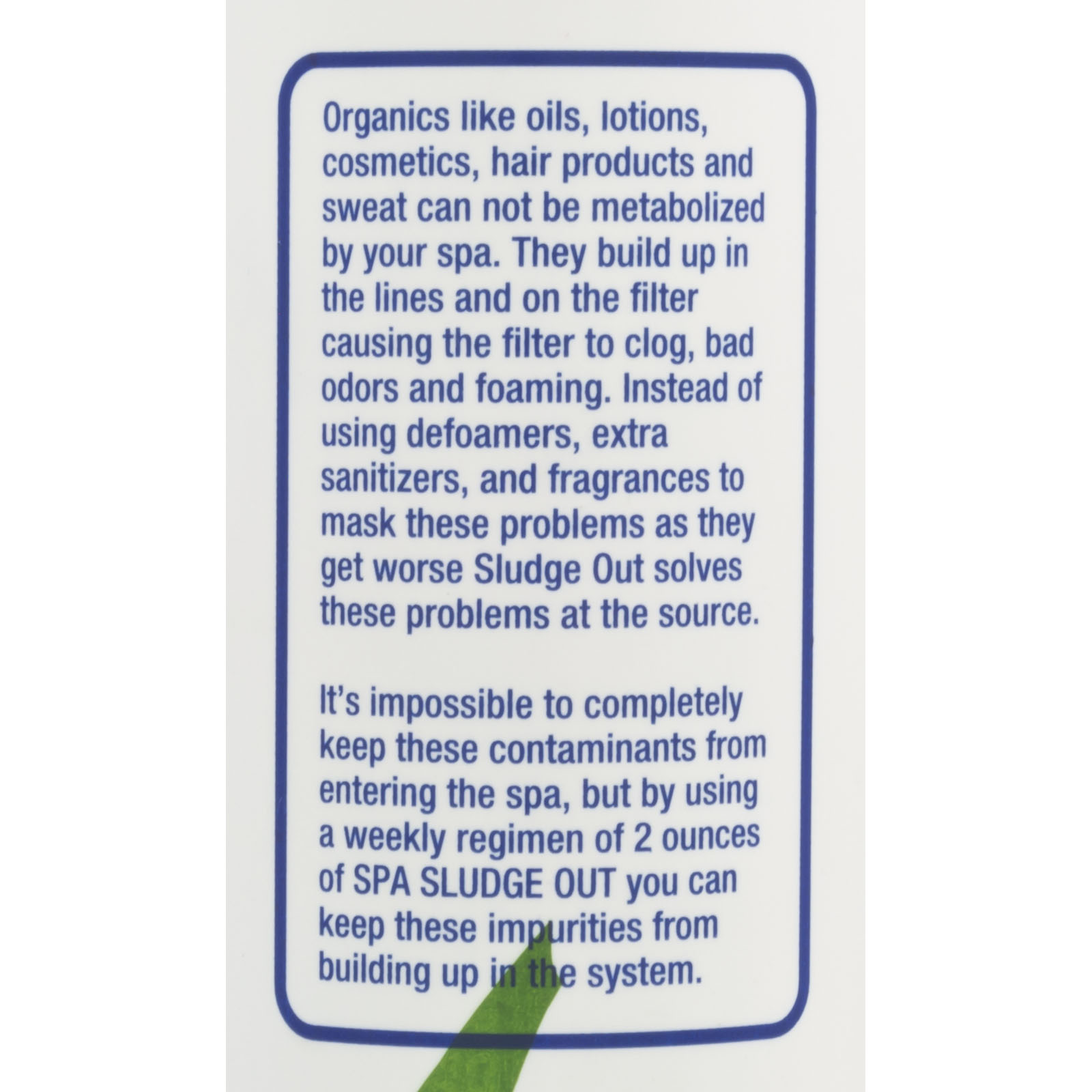 Matrix Swimming Pool SolutionsSpa Sludge OutOrganics like oils, lotions, cosmetics, hair products and sweat can not be metabolized by your spa. They build up in the lines and on the filter causing bad odors, foaming and filter clog. Instead of using defoamers, extra sanitizers, and fragrances to mask these problems as they get worse, Sludge Out solves these problems at the Source. It's impossible to completely keep these contaminants from entering the spa, but by using a weekly regimen of 2 ounces of Spa Sludge Out, you can keep these impurites from building up in the system.