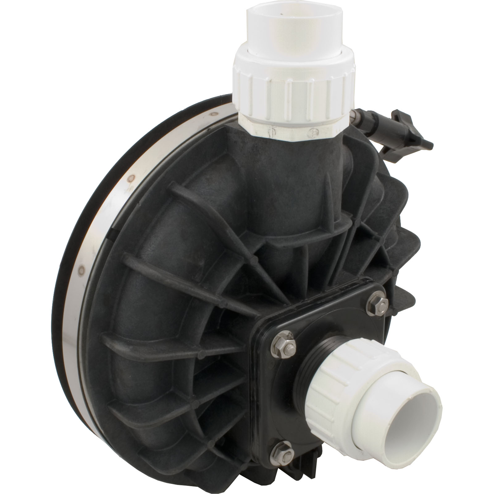 Center discharge, 1-1/2"mbt, 56 frame spa pump wet end for the 1.0hp Sonfarrel/Martec Pool Master pump. This wet end is used with a thru-bolt style motor. The motor used may be either a single or dual speed. The complete wet end includes: the volute, volute o-ring, stainless steel clamp ring, seal, diffuser, impeller, wear ring, drain plug, drain plug o-ring and seal plate.