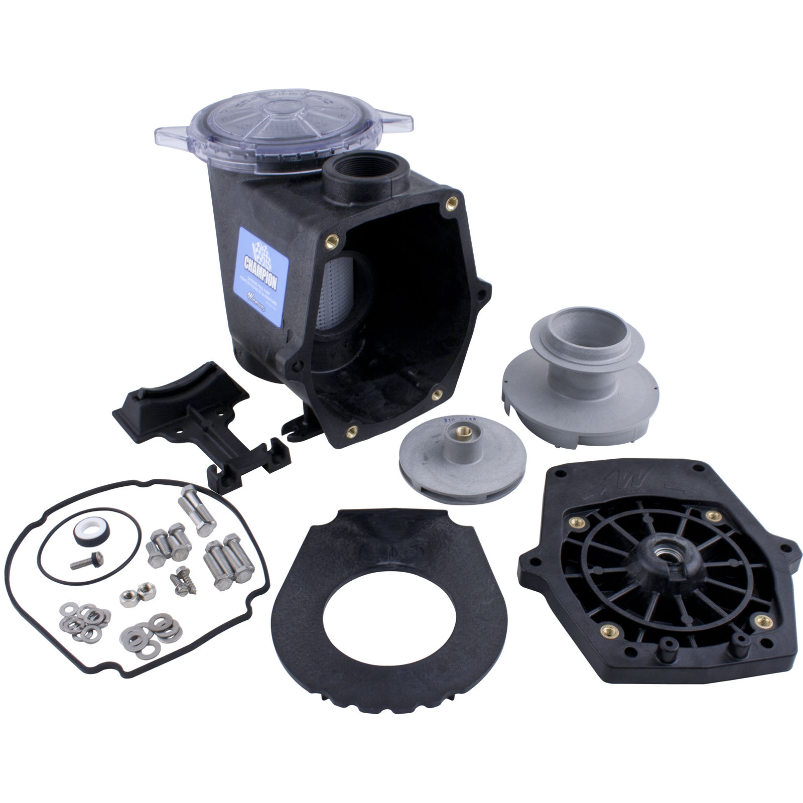 Center discharge, 2"fpt suction/discharge, 56 frame wet end for the Waterway Champion pump. This wet end is used with a 2.0hp, 56 frame, square flange style motor. The motor used may be either single or dual speed. The complete wet end includes: the face plate, face plate gasket, seal plate, seal, impeller, diffuser, trap/pump body and bolts.